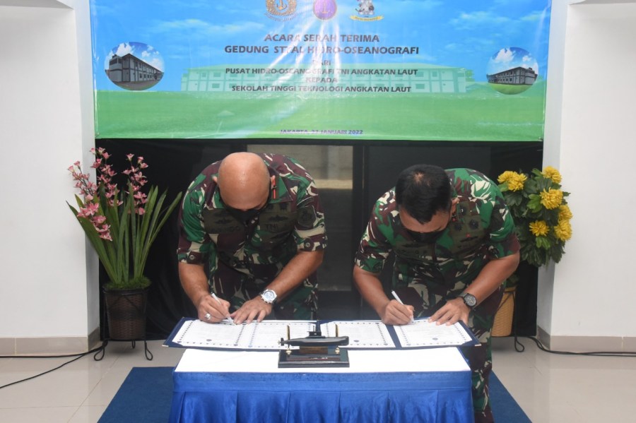 Komandan Pusat Hidro-Oseanografi TNI Angkatan Laut (Danpushidrosal) Laksamana Madya TNI Dr. Agung Prasetiawan, M.A.P., secara resmi menyerahkan Gedung Sekolah Tinggi Teknologi Angkatan Laut (STTAL) hidro-oseanografi kepada Komandan STTAL Laksamana Pertama TNI Dr. Ir. Avando Bastari, M.Phil di Sunter Kodamar Jakarta Utara, Kamis (27/01/2022)