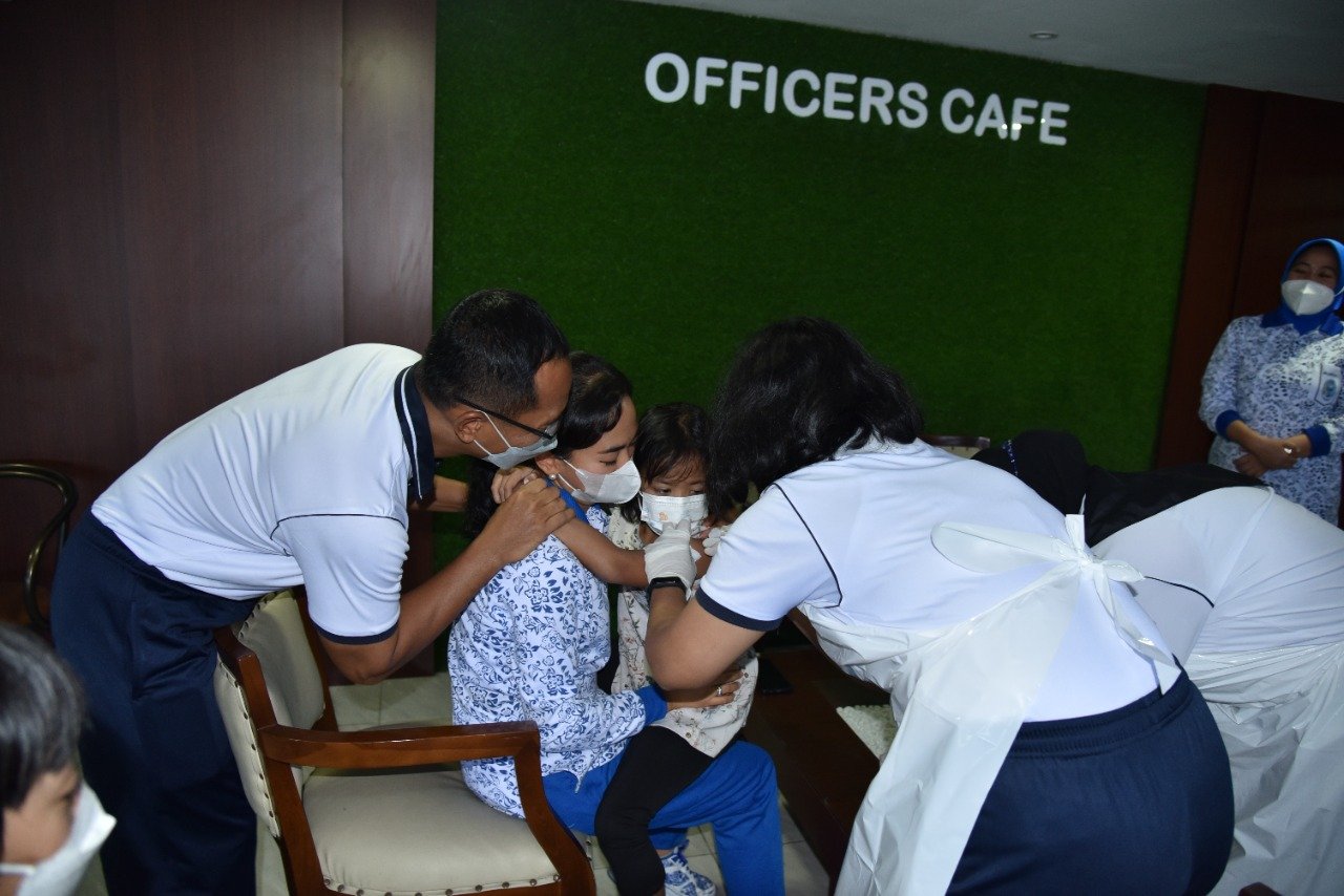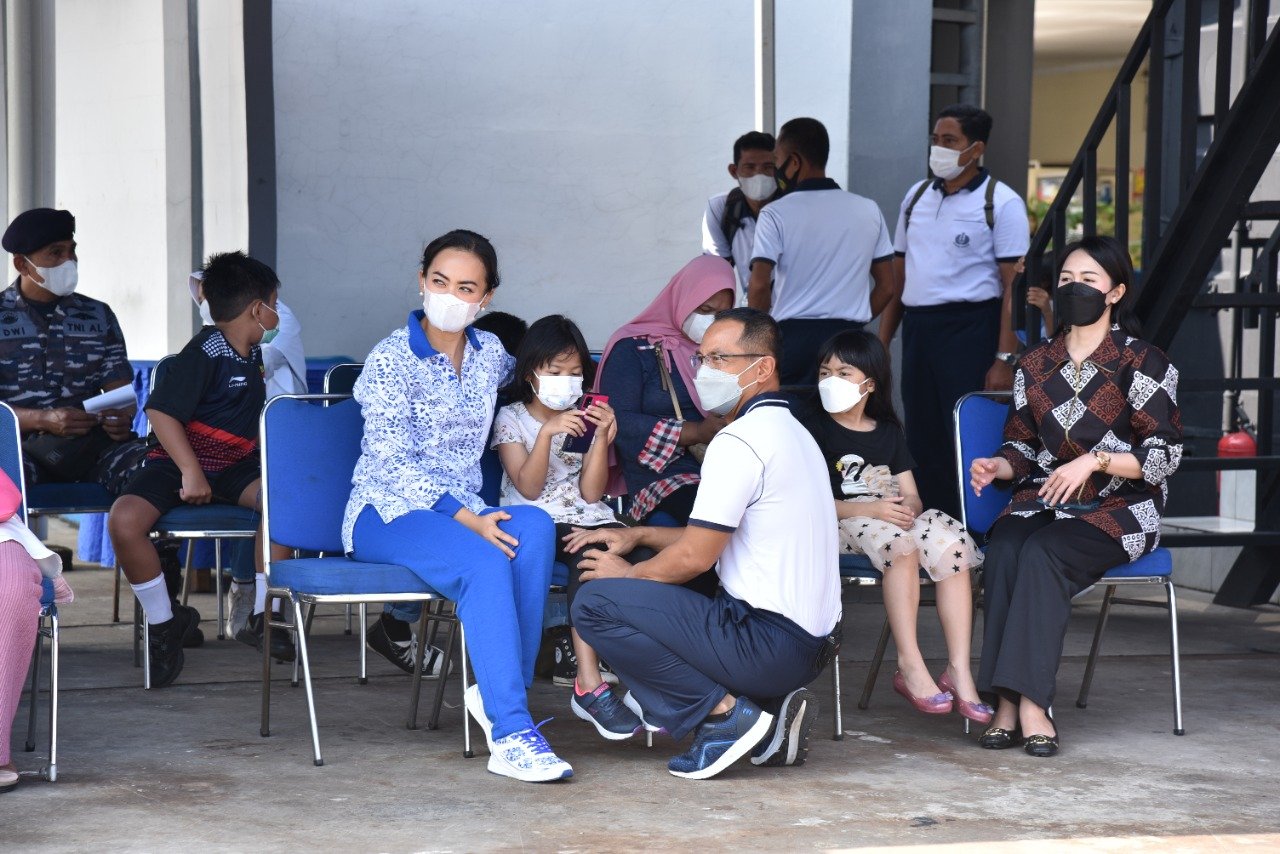 Panglima Komando Lintas Laut Militer meninjau langsung vaksinasi Covid-19 dosis 1 dan dosis 2 bagi anak usia 6-12 tahun yang dilaksanakan di Officer Cafe, Mako Kolinlamil, Tanjung Priok, Jakarta Utara, Jumat (4/2/2022). Bersama dengan Ibu Ketty Erwin S Aldedharma, Panglima Kolinlamil mendampingi putrinya untuk mendapatkan Vaksin Sinovac dosis 2.