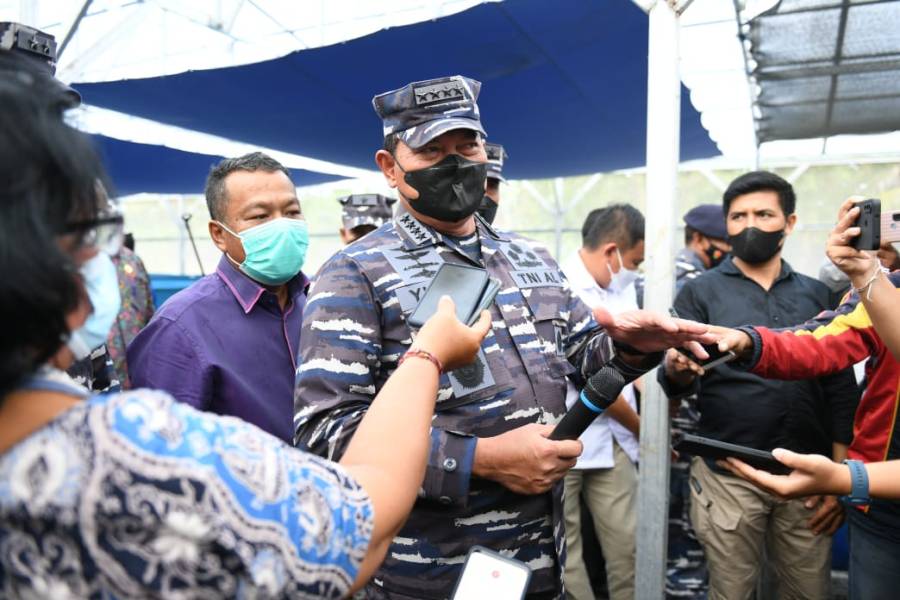 Jalesveva Jayamahe, Kepala Staf Angkatan Laut (Kasal) Laksamana TNI Yudo Margono didampingi Ketua Umum Jalasenastri Ny. Vero Yudo Margono melaksanakan peninjauan ke Laboratorium Indonesian Naval Aquagriculture Program (INAP) yang merupakan program pengembangan budidaya laut terbaru karya anak bangsa, di Desa Lovina, Kota Singaraja, Kab. Buleleng, Bali Selasa (22/2/2022).