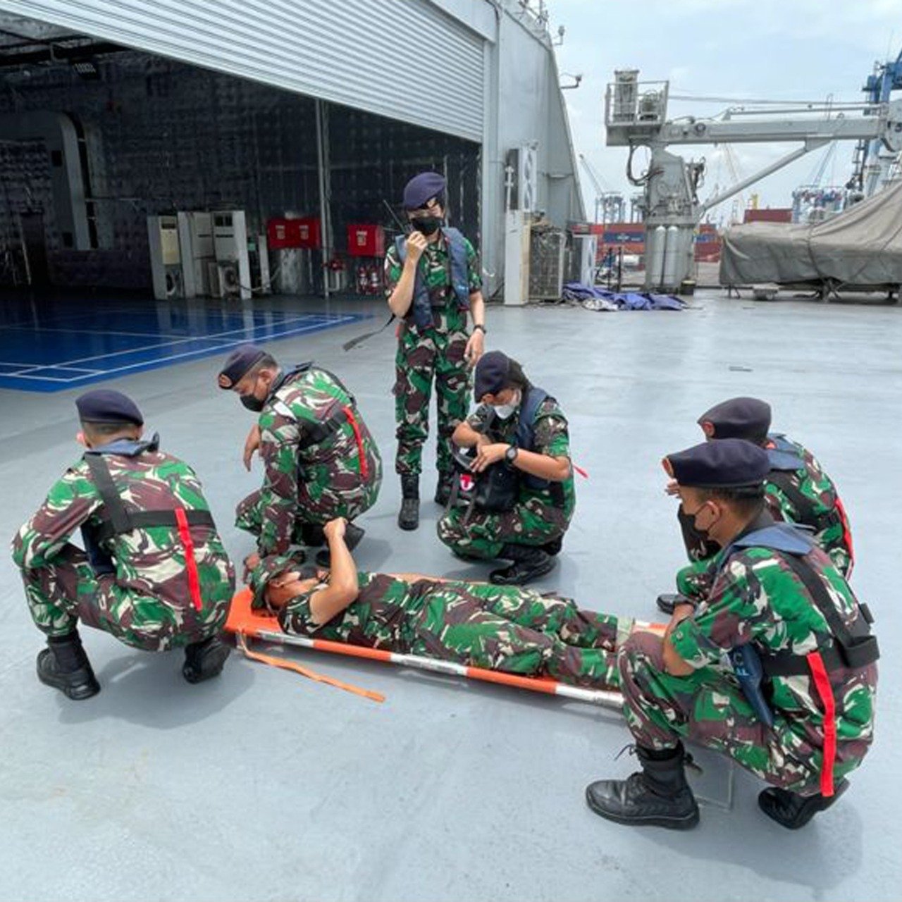 Simulasi selanjutnya dikarenakan korban membutuhkan penanganan serius, maka tim medis merujuk korban ke Rumah Sakit Angkatan Laut dan dievakuasi dengan menggunakan heli yang saat itu stand by di geladak heli guna mendukung kegiatan KRI Banda Aceh-953.