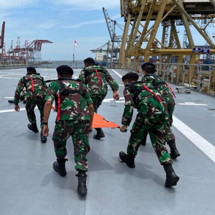 Simulasi selanjutnya dikarenakan korban membutuhkan penanganan serius, maka tim medis merujuk korban ke Rumah Sakit Angkatan Laut dan dievakuasi dengan menggunakan heli yang saat itu stand by di geladak heli guna mendukung kegiatan KRI Banda Aceh-953.