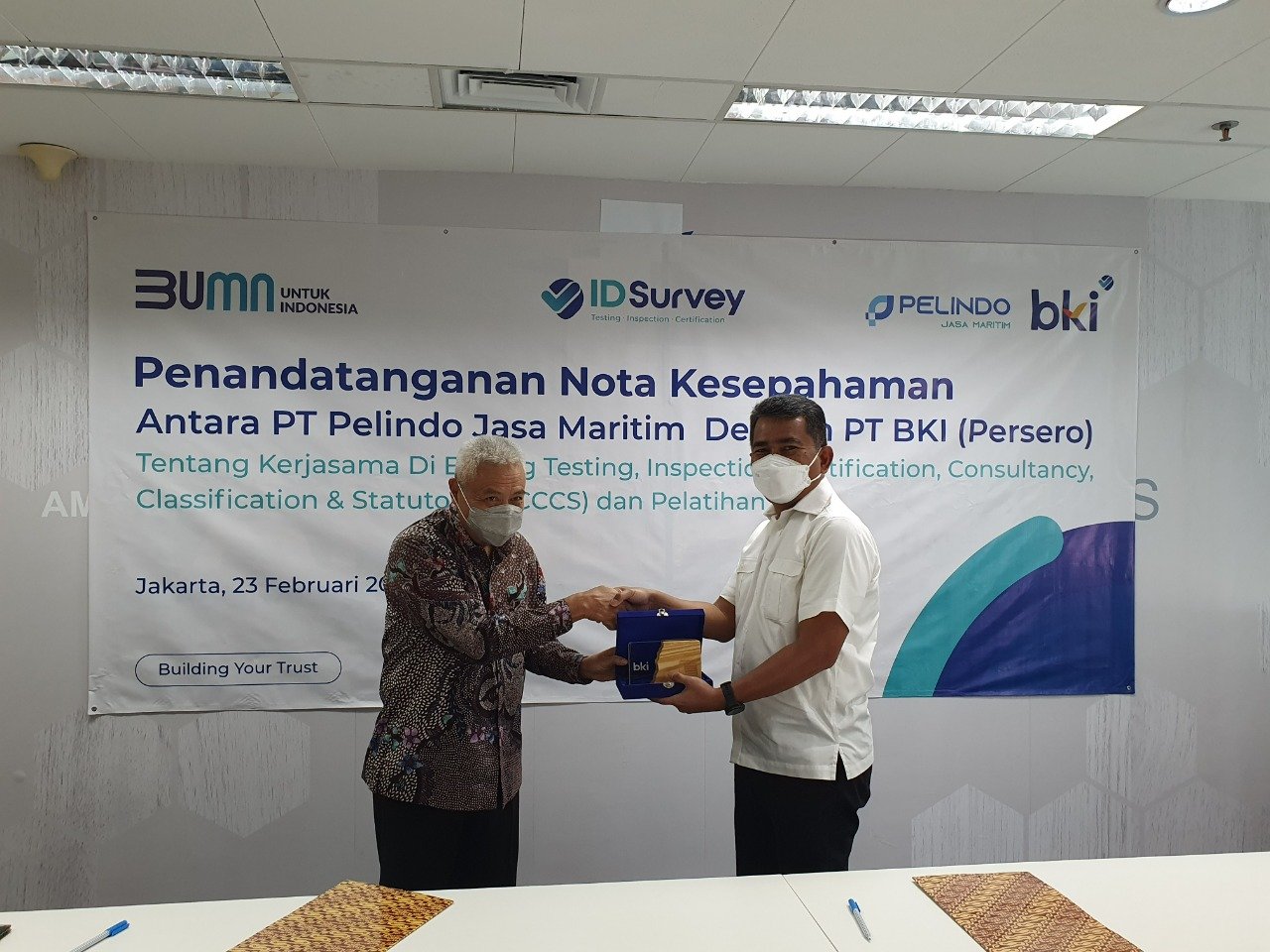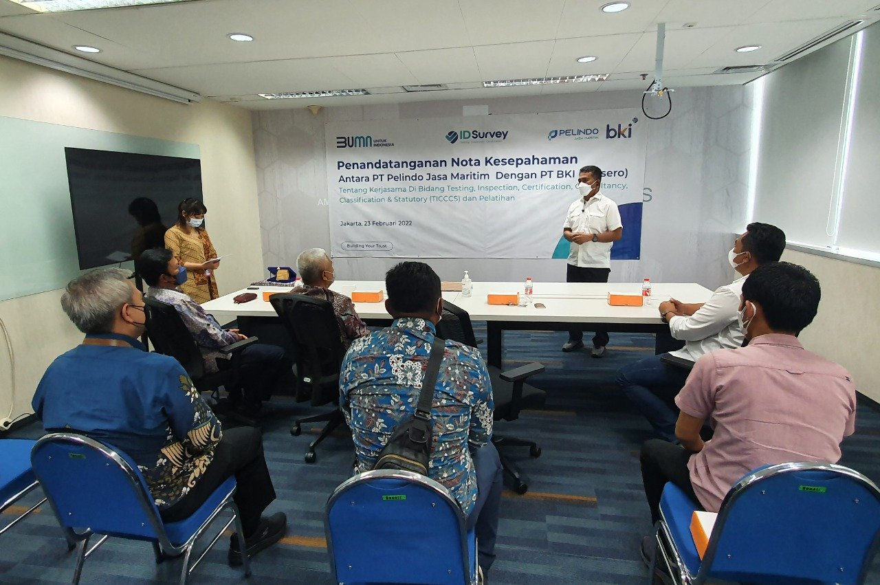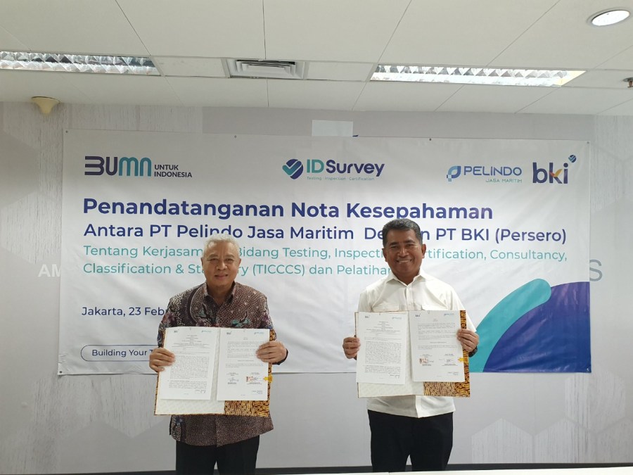 Nota kesepahaman tersebut ditandatangani oleh Direktur Strategi & Teknik Subholding Pelindo Jasa Maritim (SPJM) Hosadi Apriza Putra dan Direktur Operasi PT Biro Klasifikasi Indonesia (BKI) Mohammad Cholil, di Kantor Perwakilan SPJM, Menara Ravindo Lt. 5, Jakarta, beberapa waktu lalu.