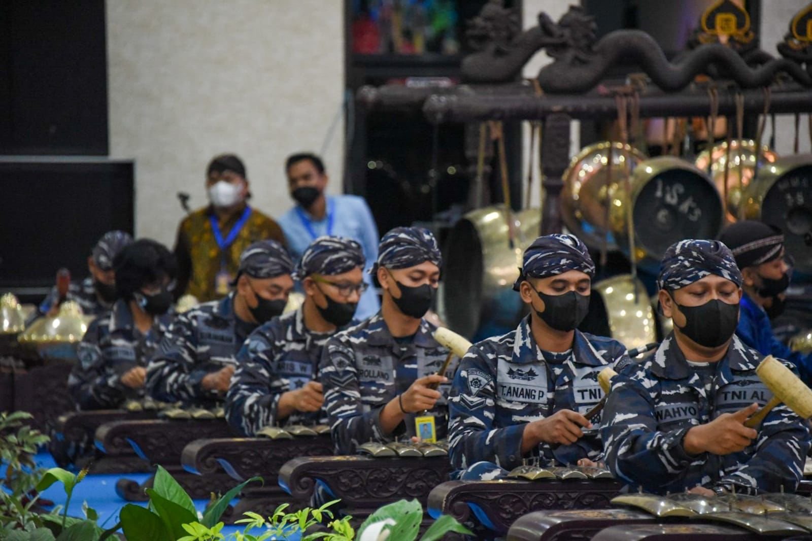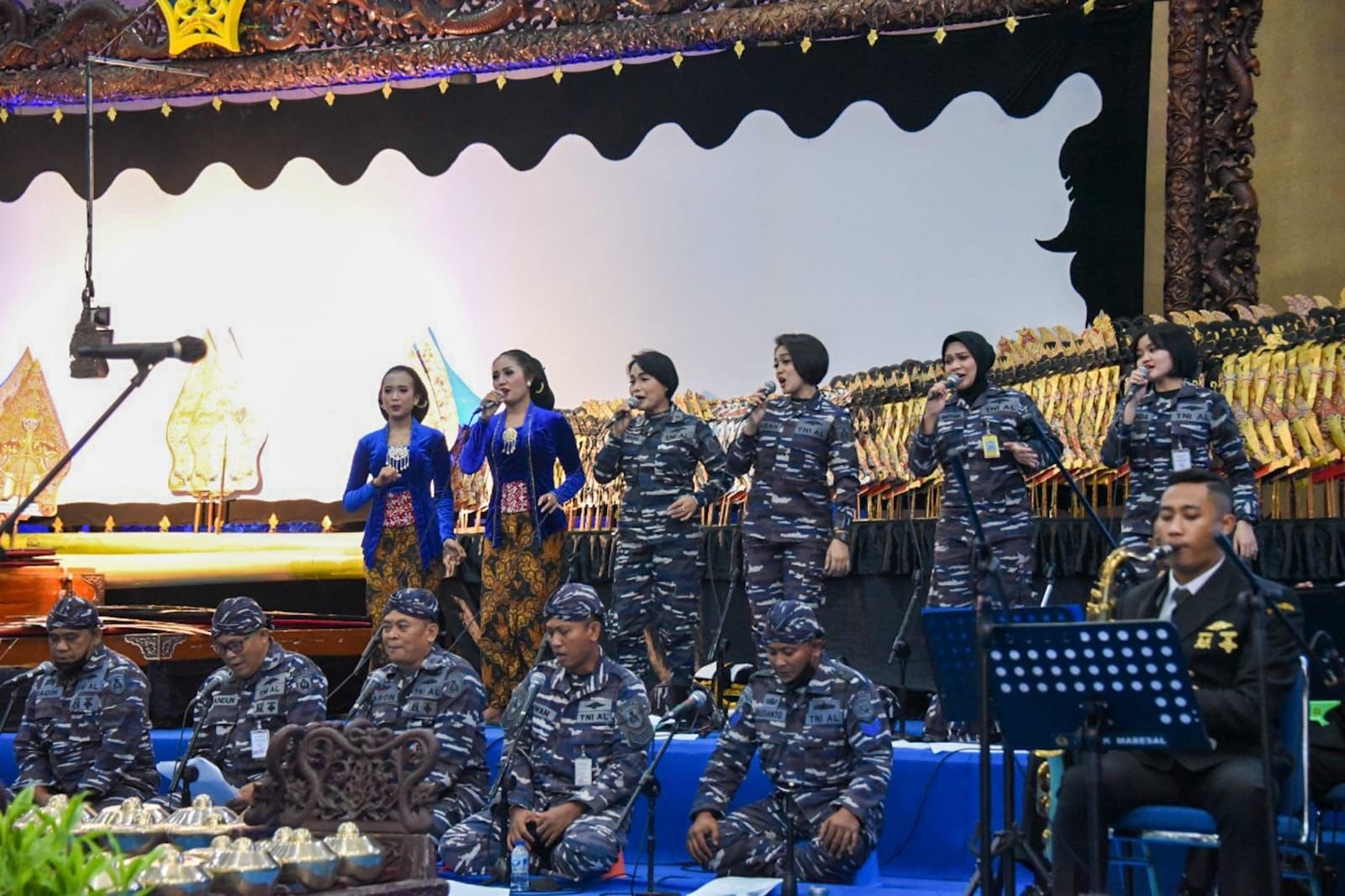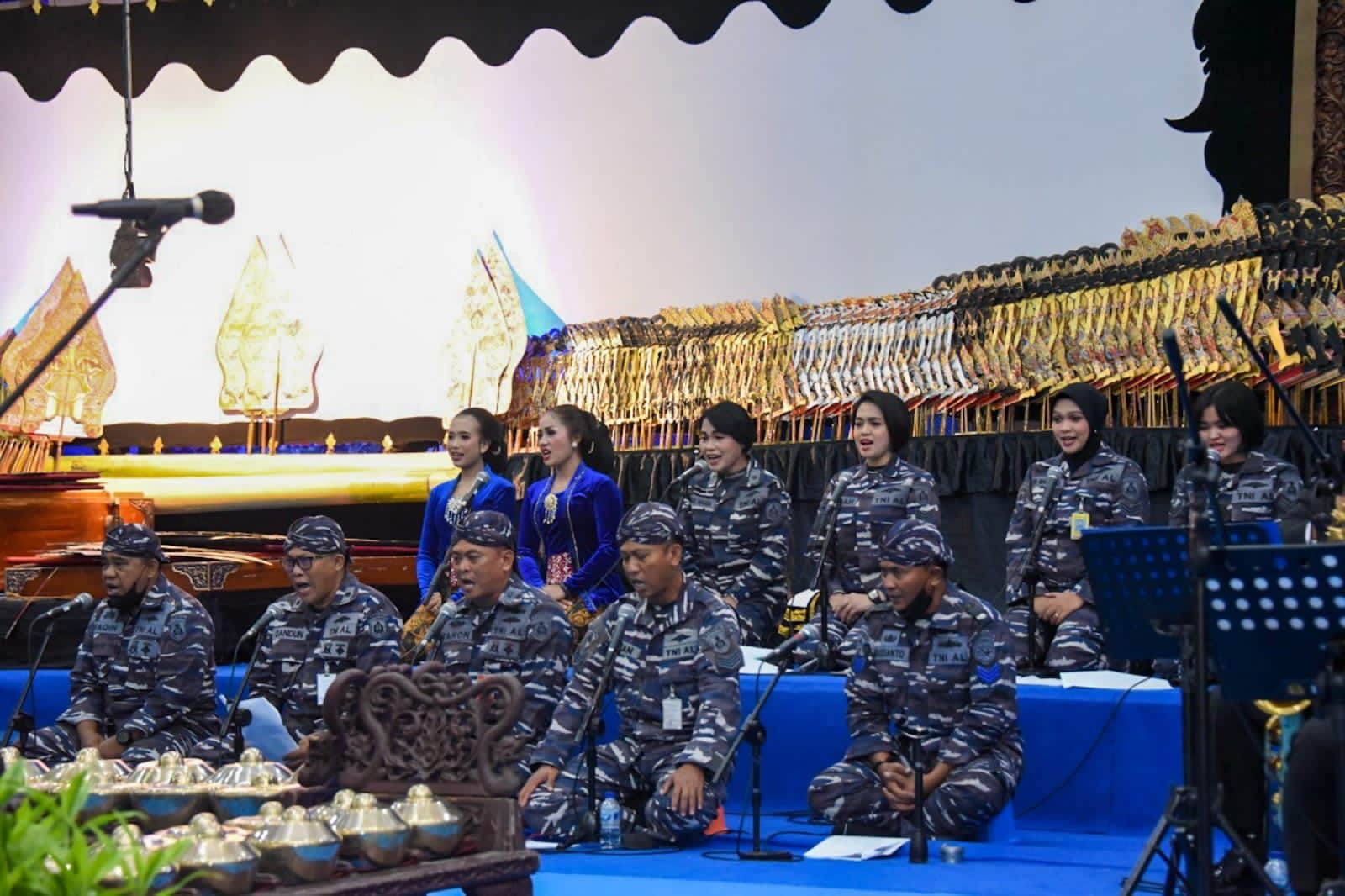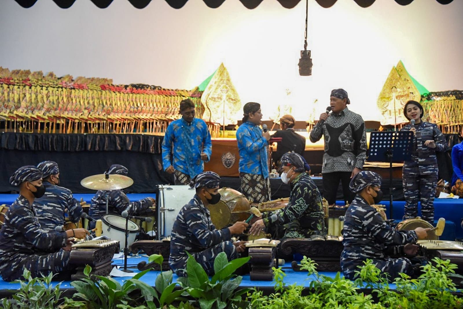 Pagelaran wayang kulit ini nampak agak sedikit berbeda dengan keterlibatan para prajurit TNI AL dengan seragam PDL TNI AL mendampingi para Sinden dan sebagai pengawak gambelan yang dikolaborasi dengan orchestra prajurit TNI AL dengan seragam Navy Black.