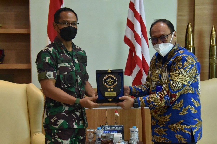Panglima Komando Lintas Laut Militer Laksda TNI Erwin S Aldedharma menerima kunjungan kerja Kepala Kantor Syahbandar dan Otoritas Pelabuhan (KSOP) Kelas IV Marunda Capt. Isa Amsyari, M.M.Tr., M.Mar. di Mako Kolinlamil, Tanjung Priok, Jakarta Utara, Senin (14/3/2022).