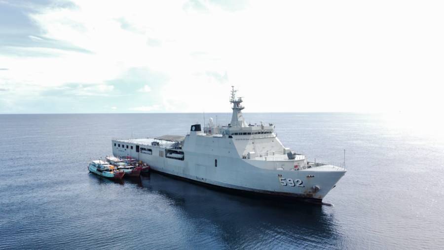 KRI Banjarmasin-592 usai melaksanakan debarkasi pasukan dari satuan Batalyon Infanteri Raider 113/Jaya Sakti dan Batalyon Infanteri Raider 301/Prabu Kian Santang di Dermaga PT Freeport Timika Papua melanjutkan pelayaran menuju pangkalan Surabaya. Pada saat lintas laut di perairan Laut Arafuru, KRI BJM-592 melaksanakan peran pemeriksaan dan penggeledahan terhadap 4 kapal ikan Indonesia, Minggu (20/3/2022).