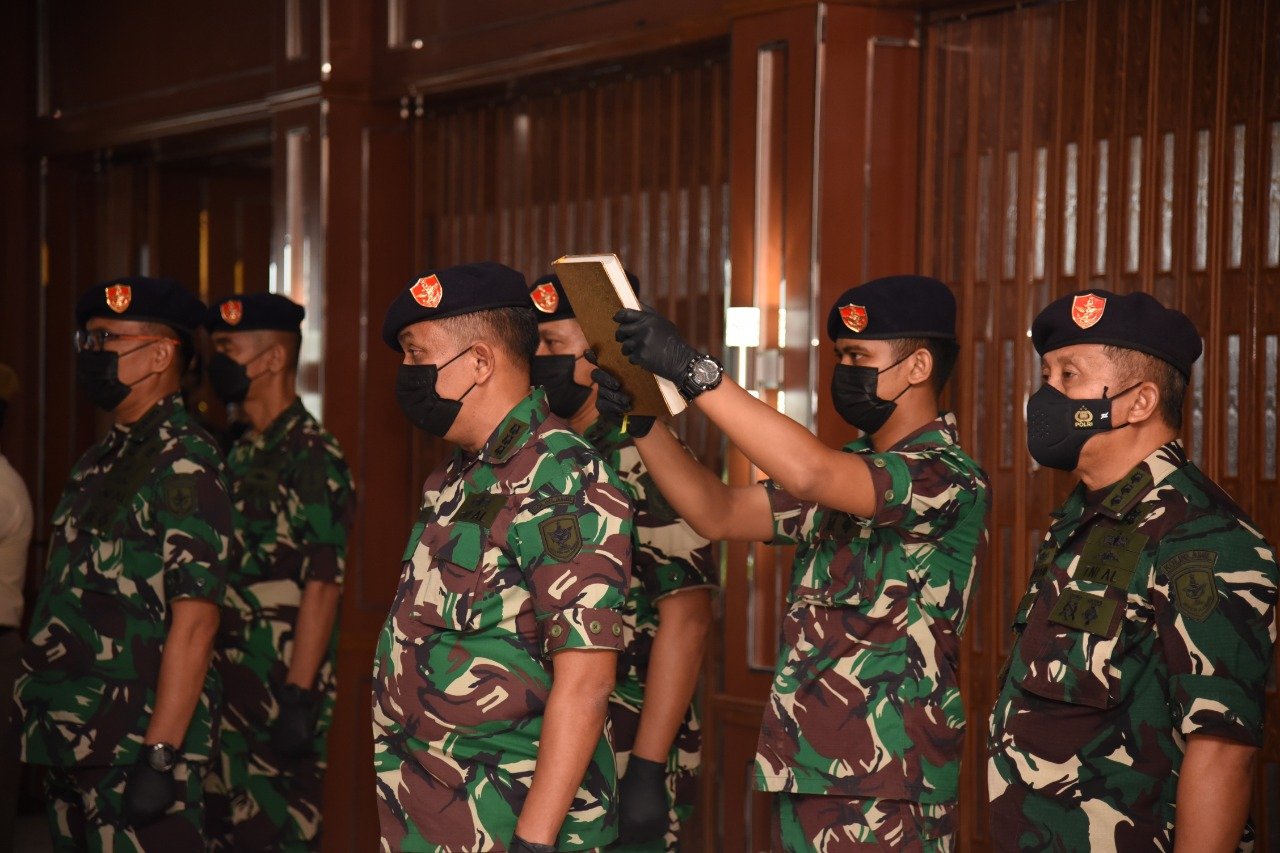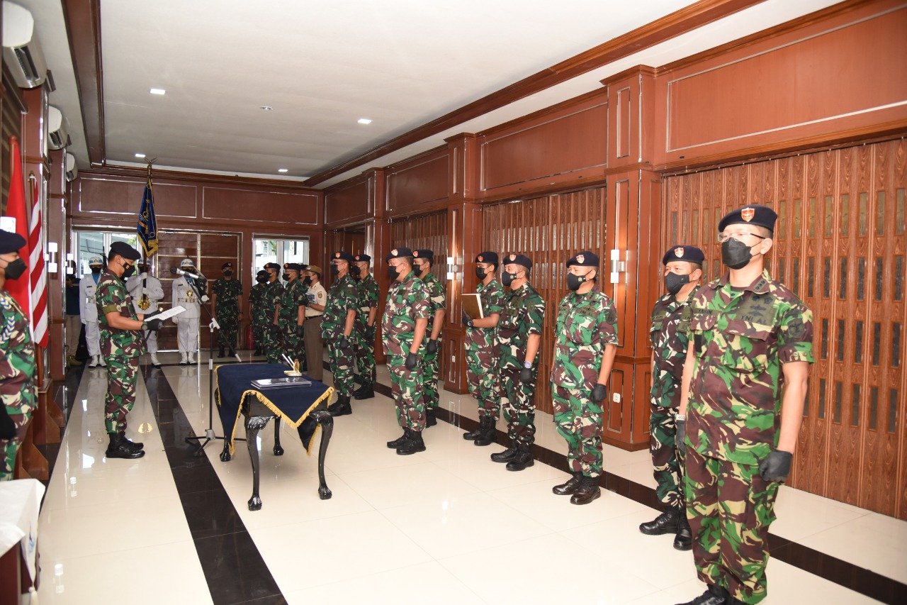 Panglima Komando Lintas Laut Militer Laksda TNI Erwin S. Aldedharma memimpin acara pengambilan sumpah, penandatanganan pakta integritas dan serah terima jabatan di lingkungan Kolinlamil bertempat di Gedung Laut Nusantara, Rabu (23/3/2022)