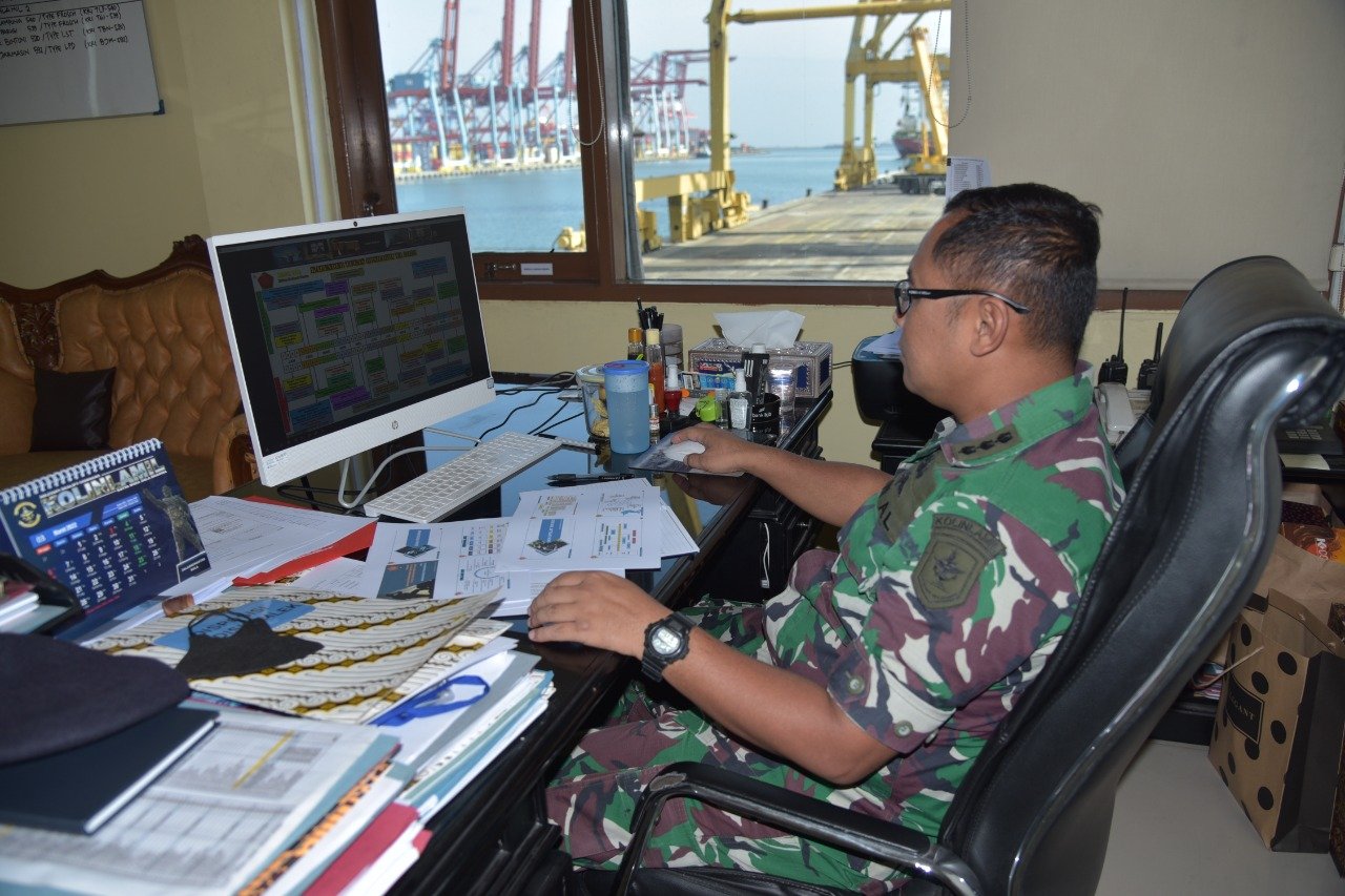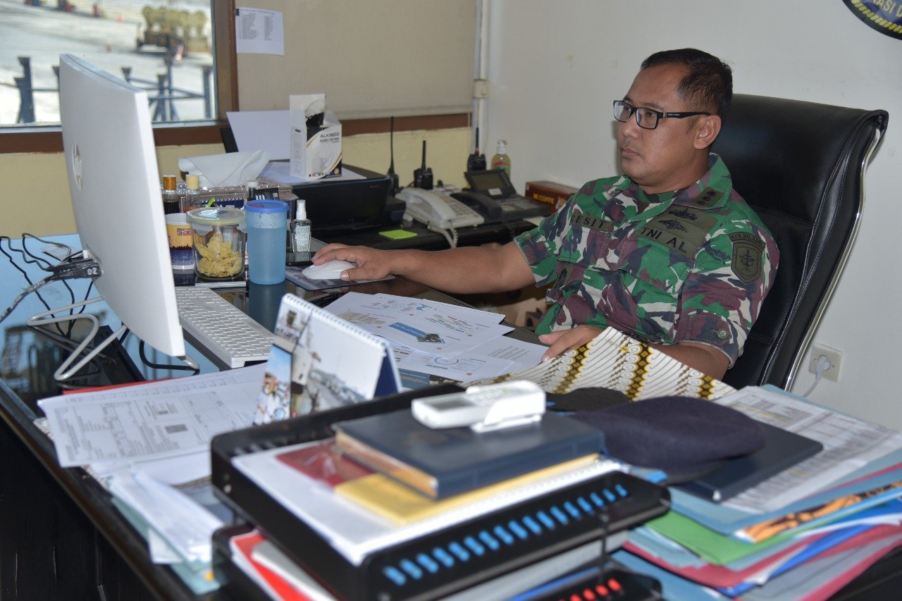 Kadiskomlek Kolinlamil Kolonel Laut (E) Gesit Pratiknyo mengikuti rapat koordinasi komunikasi dan elektronika melalui video conference di ruang kerjanya, Gedung Laut Jawa, Mako Kolinlamil, Tanjung Priok, Jakarta Utara, Rabu (23/3/2022)