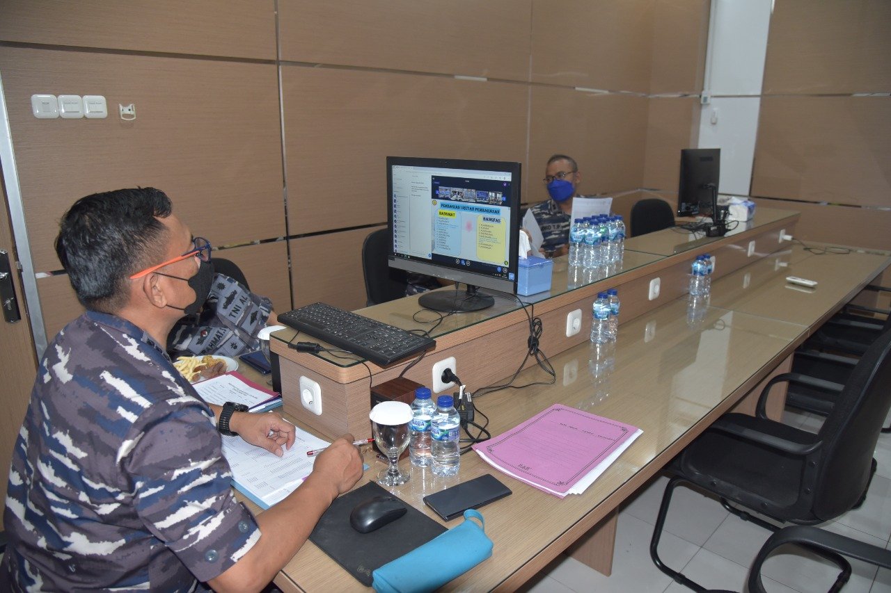 Mewakili Panglima Komando Lintas Laut Militer Laksda TNI Erwin S. Aldedharma, Asisten Logistik Pangkolinlamil Kolonel Laut (T) Siswanto mengikuti kegiatan pra perencanaan anggaran dan keuangan (Pra Renaku) terkait pengembangan fasilitas dan pengembangan material kewasgiataan Staf Logistik Angkatan Laut tahun 2023 melalui video conference, di Mako Kolinlamil, Tanjung Priok, Jakarta Utara, Jumat (25/3/2022).
