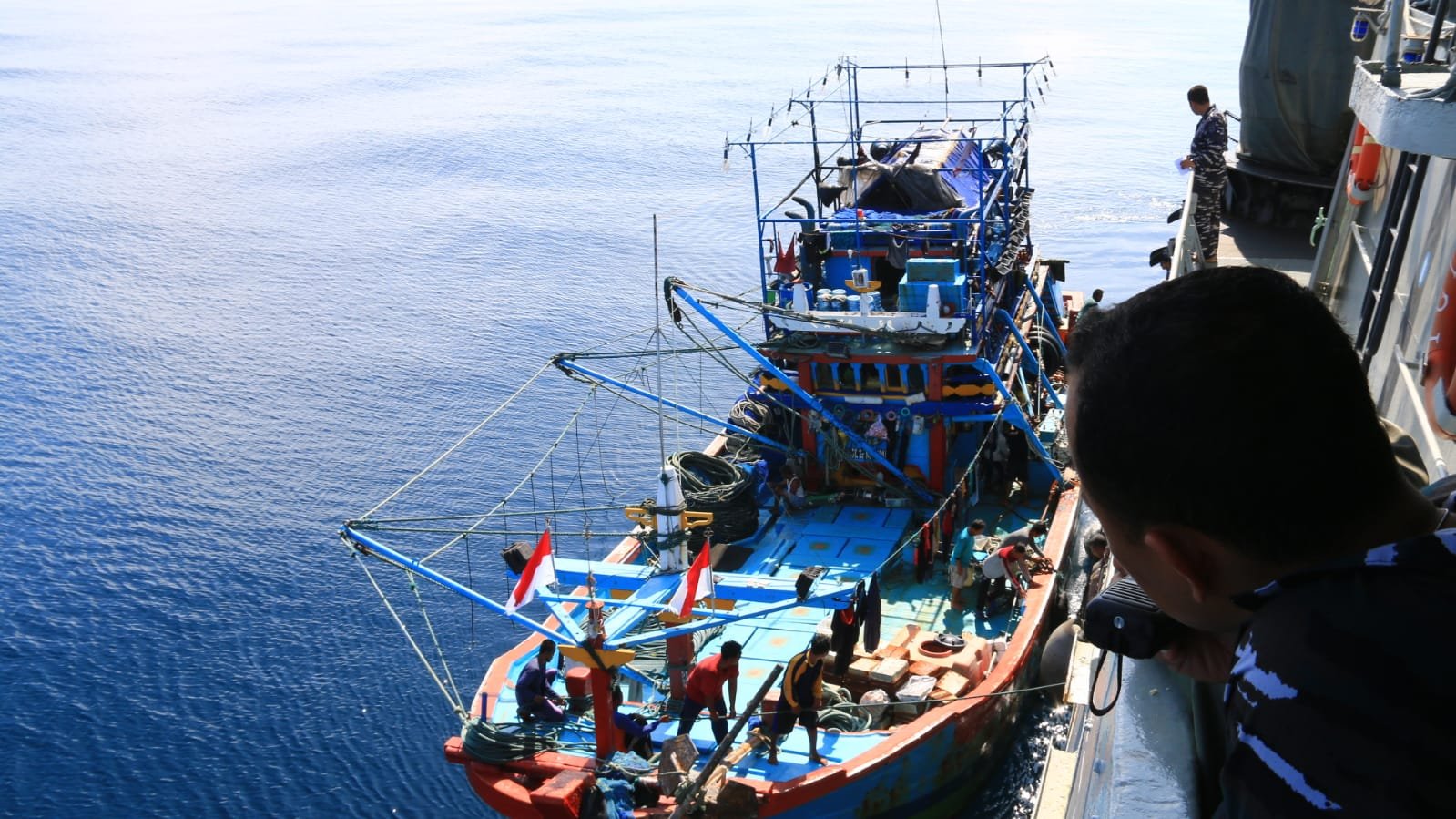 Melalui komunikasi radio, kapal ikan tersebut diminta untuk merapat ke lambung KRI TGI-539 untuk dilaksanakan pemeriksaan terhadap dokumen, anak buah kapal dan muatannya. Kedua kapal ikan yang teridentifikasi dengan nama KM Bintang Mas Sejati dan KM Karya Jaya berasal dari Jawa Tengah, nelayan Pekalongan dan nelayan Juana.
