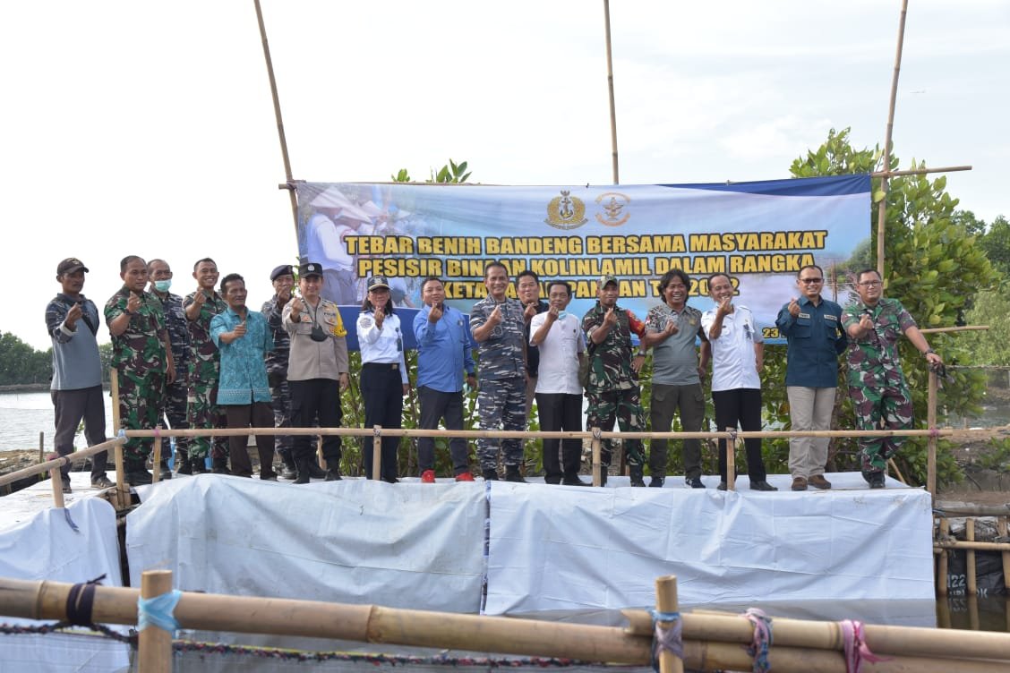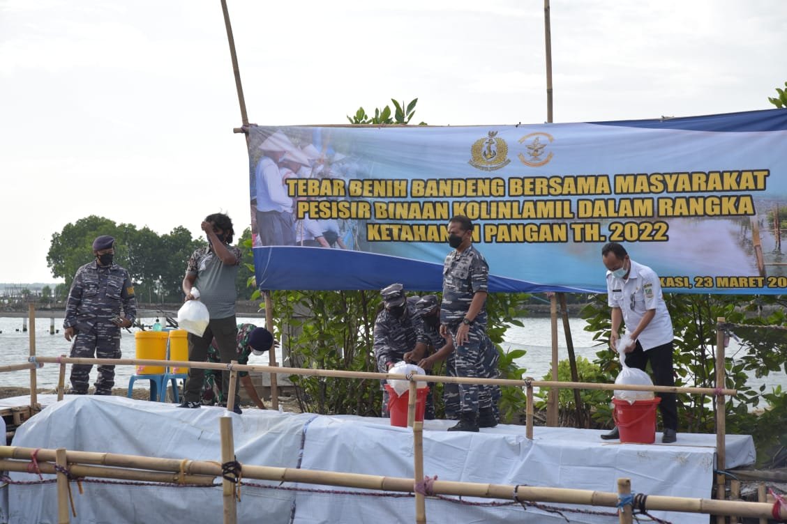 Komando Lintas Laut Militer melalui Staf Potensi Maritim melaksanakan penebaran benih ikan bandeng dalam rangka mendukung Pemerintah terkait program ketahanan pangan nasional yang digelar di tambak nelayan Desa Segara Jaya, Kecamatan Taruma Jaya, Kabupaten Bekasi.