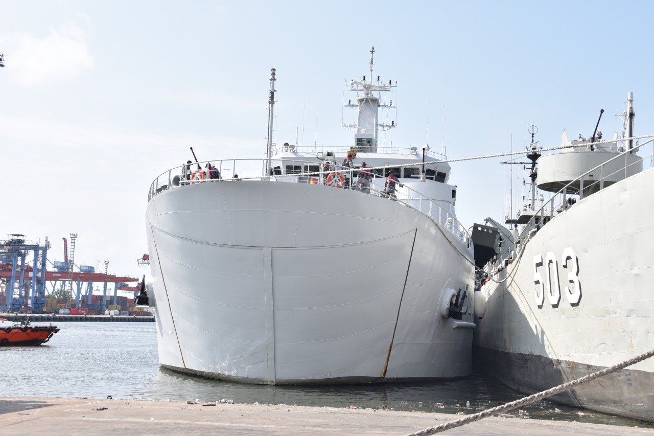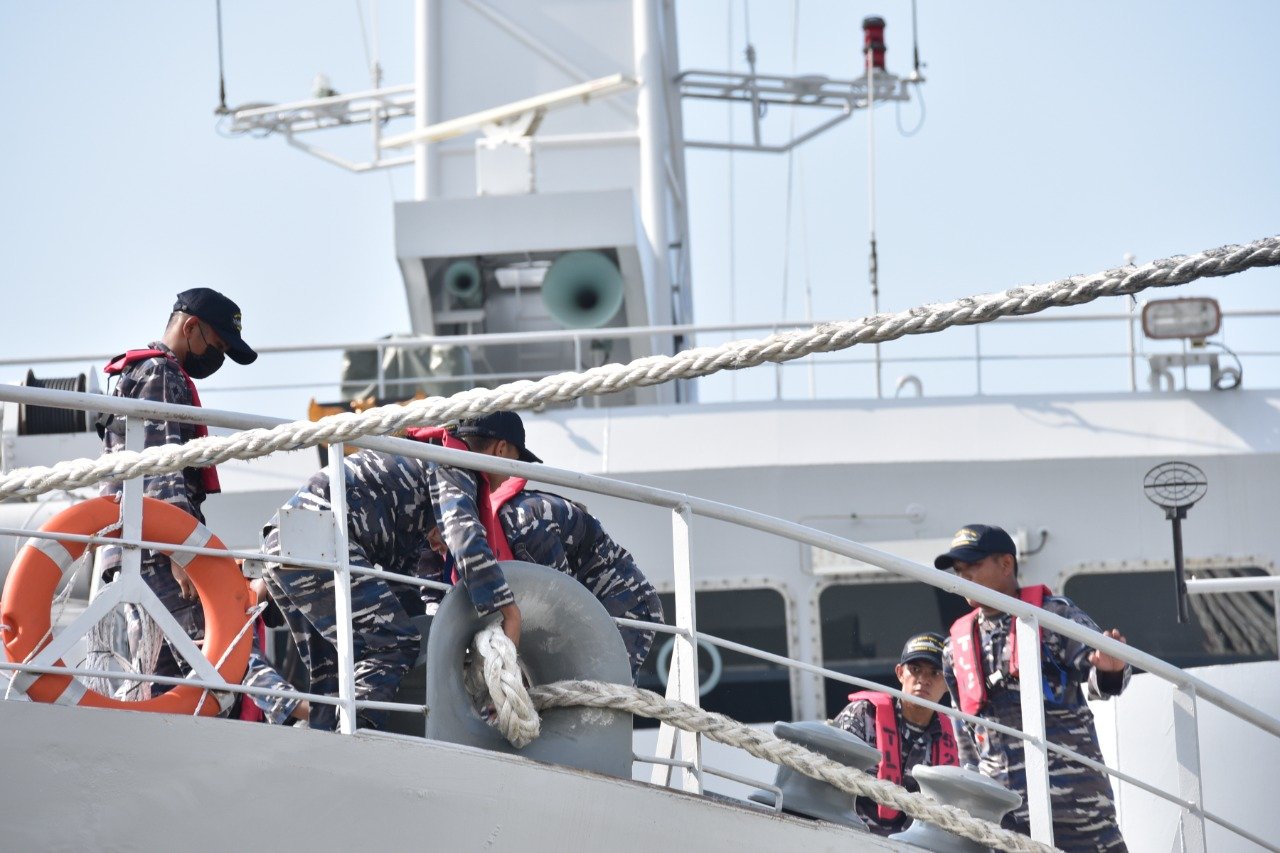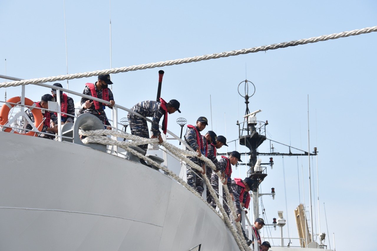 KRI Teluk Palu-523 yang beberapa waktu lalu telah diresmikan oleh Kepala Staf Angkatan Laut Laksamana Yudo Margono sebagai alutsista TNI AL yang baru tiba di Dermaga Mako Kolinlamil, Tanjung Priok, Jakarta Utara, Senin (28/3/2022)