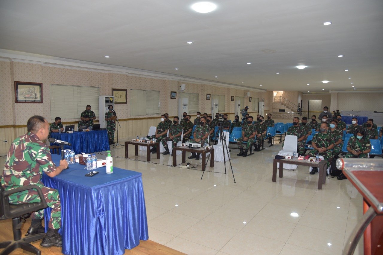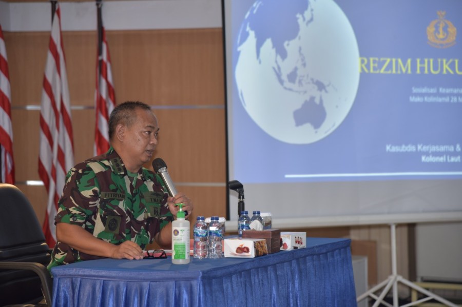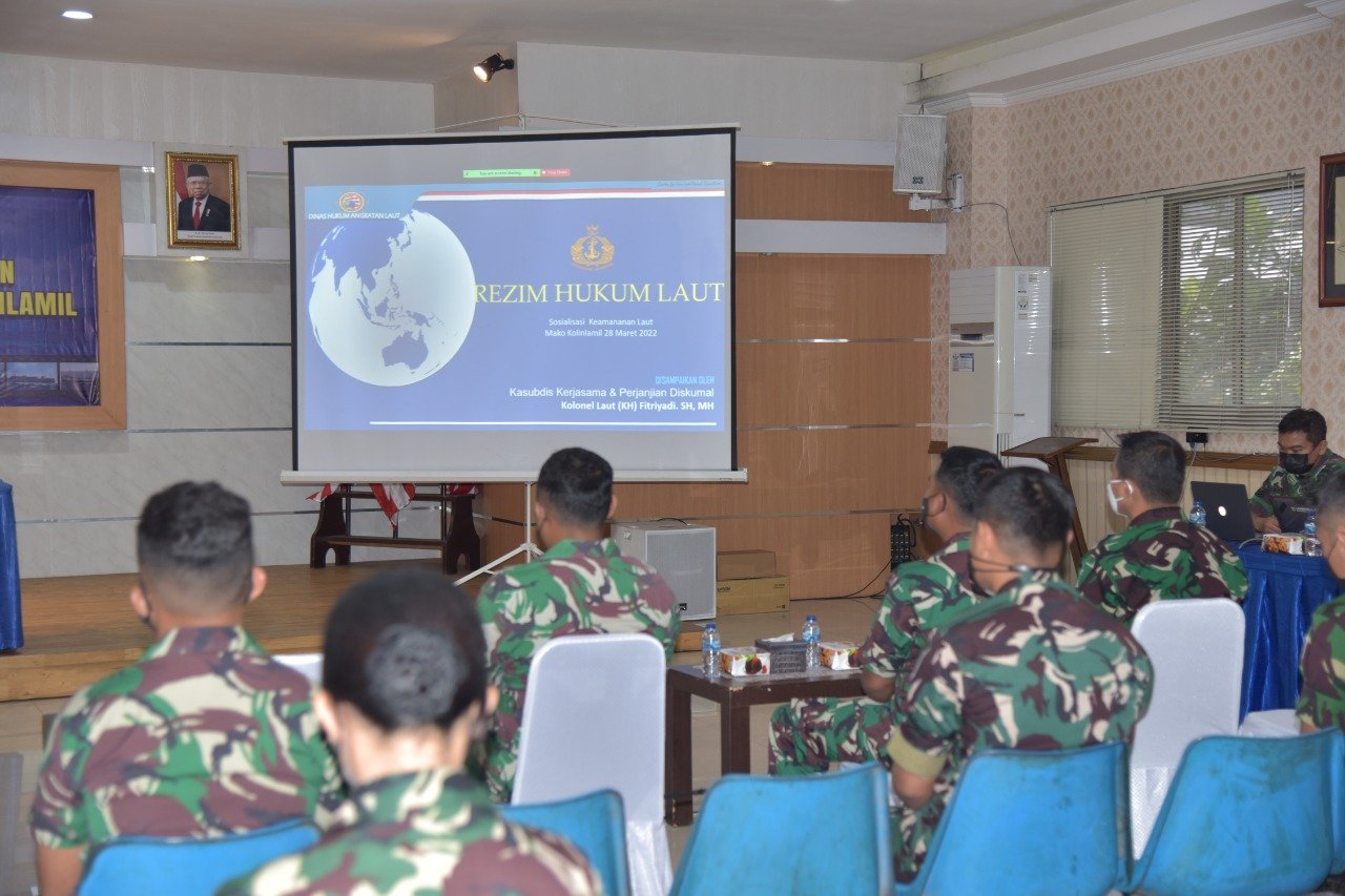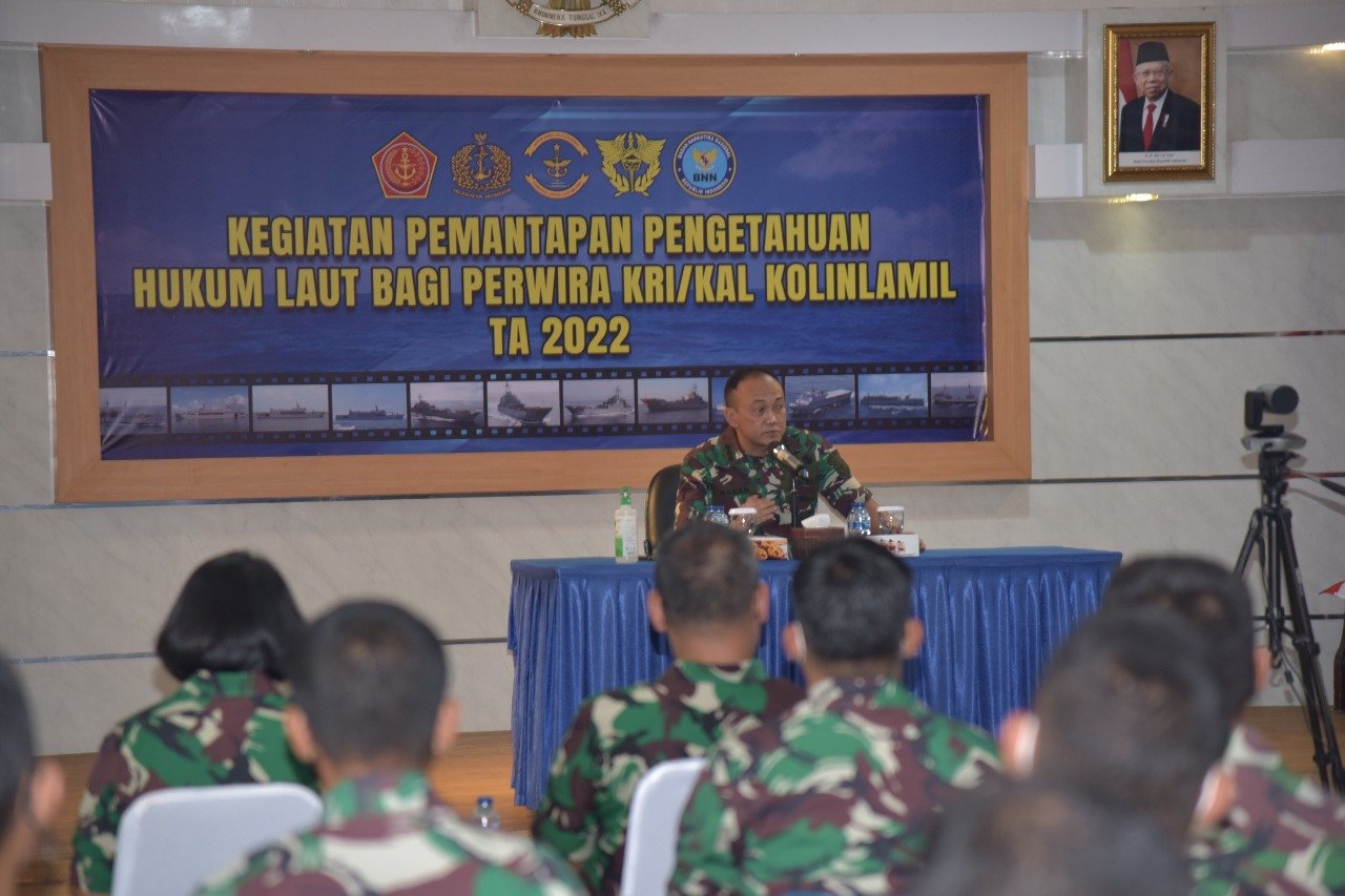 Staf Operasi Komando Lintas Laut Militer mengadakan kegiatan pemantapan pengetahuan hukum laut bagi Perwira Kolinlamil di Gedung Laut Natuna, Mako Kolinlamil, Tanjung Priok, Jakarta Utara, Senin (28/3/2022).