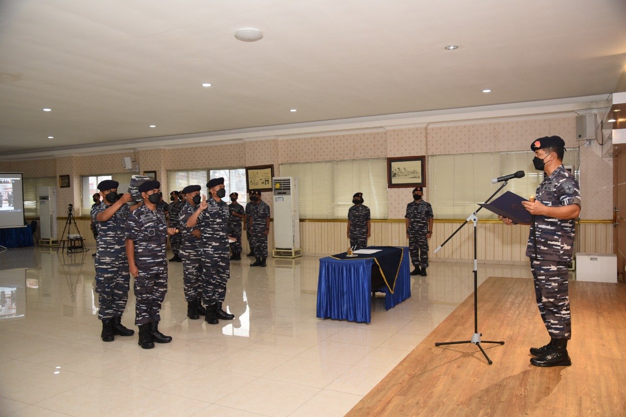 Panglima Komando Lintas Laut Militer Laksda TNI Erwin S. Aldedharma memimpin upacara penyumpahan Perwira penyidik tindak pidana tertentu (tipiter) TNI AL di jajaran Kolinlamil tahun 2022 di Gedung Laut Natuna, Mako Kolinlamil, Tanjung Priok Jakarta Utara, Jumat (1/4/2022).