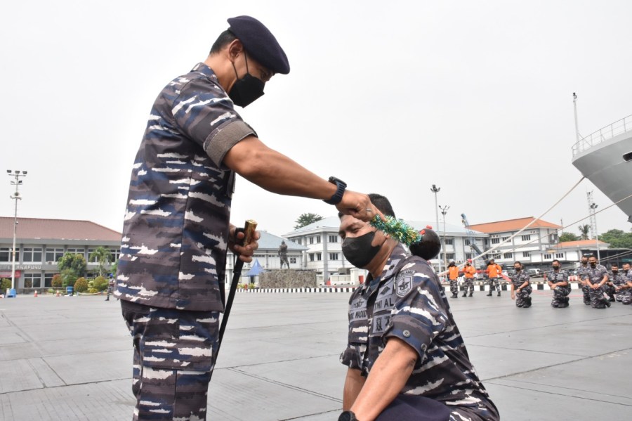 Panglima Komando Lintas Laut Militer Laksda TNI Erwin S. Aldedharma memimpin langsung acara tradisi kenaikan pangkat prajurit dan Pegawai Negeri Sipil Kolinlamil periode waktu 1 April 2022 di lapangan Mulyono Silam, Mako Kolinlamil, Tanjung Priok Jakarta Utara, Jumat (1/4/2022)