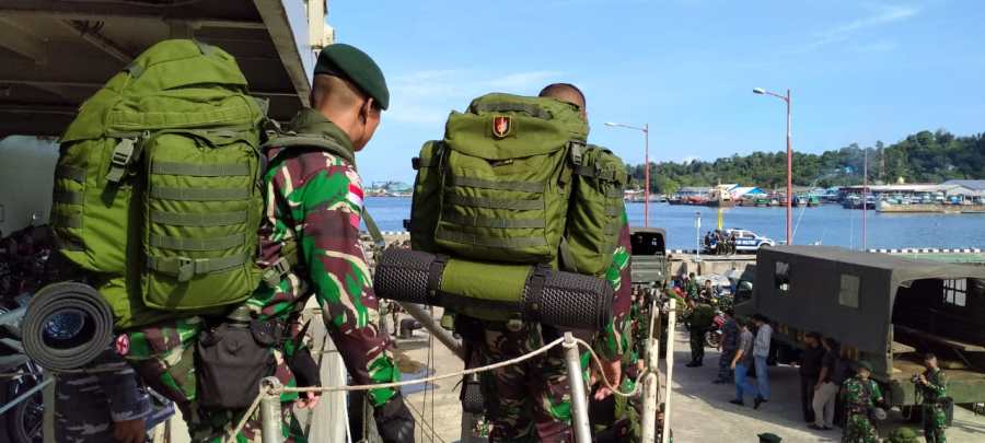 Kapal perang jenis angkut tank (AT) menurunkan 200 prajurit Yonif Raider Khusus 136/Tuah Sakti berikut persenjataan dan kendaraan taktis yang akan digunakan pada saat bertugas sebagai pasukan pengamanan perbatasan di wilayah Papua dan Papua New Guinea.