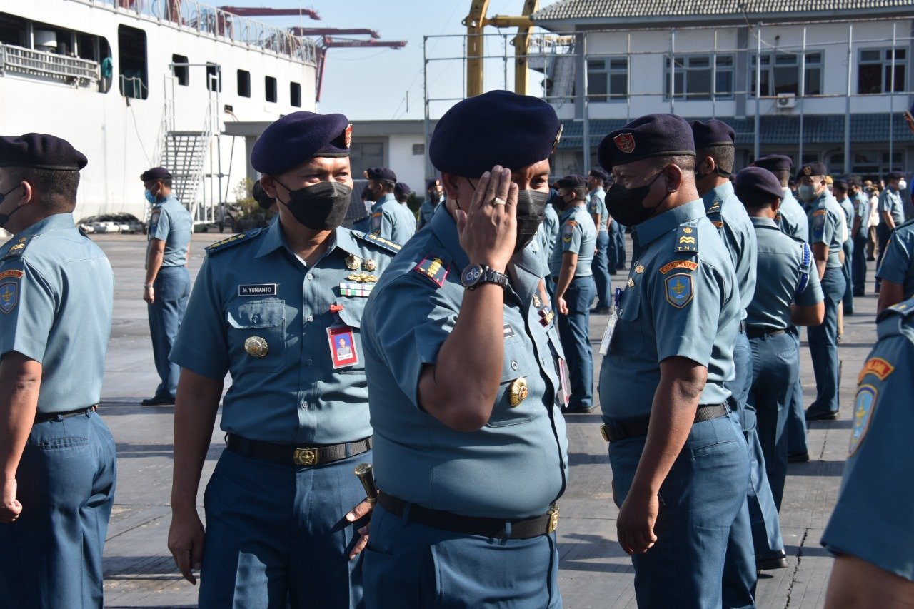 Komandan Denma Komando Lintas Laut Militer Kolonel Laut (P) Saekhul Anwar mengambil apel pengecekan penggunaan pakaian dinas harian TNI AL di lapangan Mulyono Silam, Mako Kolinlamil, Tanjung Priok, Jakarta Utara, Rabu (6/4/2022)