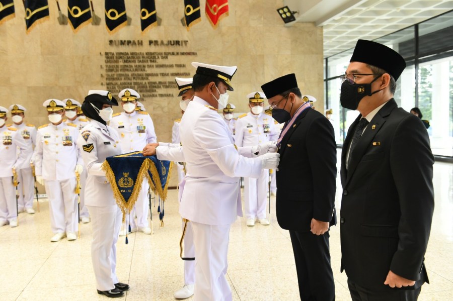 Panglima Komando Lintas Laut Militer Laksda TNI Erwin S. Aldedharma menghadiri acara penyematan Tanda Kehormatan Bintang Jalasena oleh Kepala Staf Angkatan Laut Laksamana TNI Yudo Margono kepada dua pejabat Badan Pemeriksa Keuangan RI di Mabesal, Cilangkap, Jakarta Timur, Senin (11/4/2022).