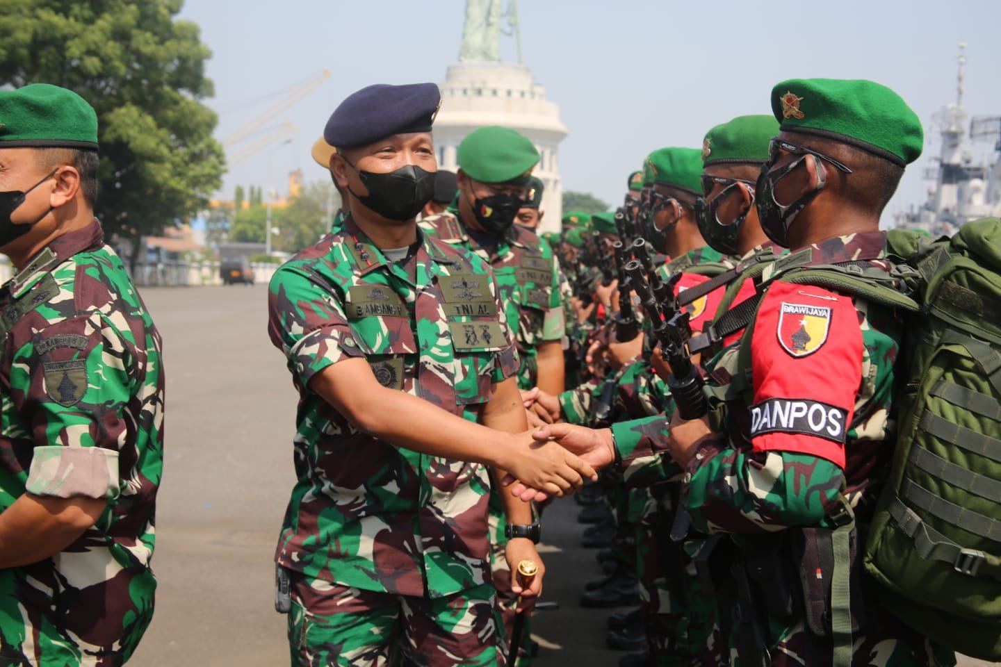 Panglima Kodam V Brawijaya dalam sambutannya mengucapkan selamat datang kepada seluruh prajurit baik dari unsur KRI Banjarmasin-592 maupun Prajurit Yonif Mekanis 521/Dadaha Yodha dan tidak lupa Pangdam V Brawijaya mengucapkan syukur kepada Tuhan Yang Maha Esa atas anugerah keselamatan dan kesehatan yang telah diberikan sehingga seluruh prajurit berikut materilnya tiba dengan selamat di Surabaya.