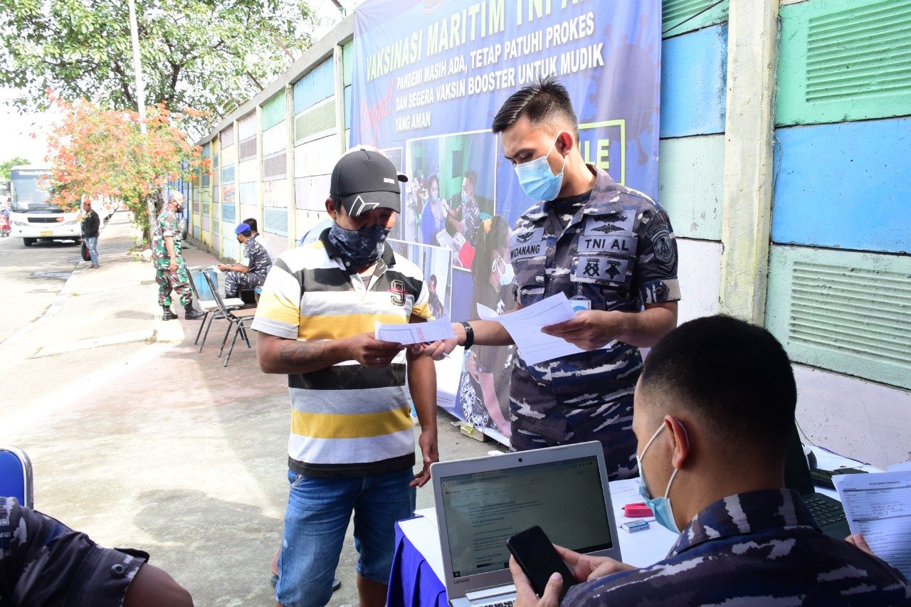 Menjelang mudik Lebaran tahun 2022, TNI AL menggelar Vaksinasi Covid-19 bagi masyarakat maritim di kawasan Tanjung Priok Jakarta Utara, Selasa (26/4/2022).