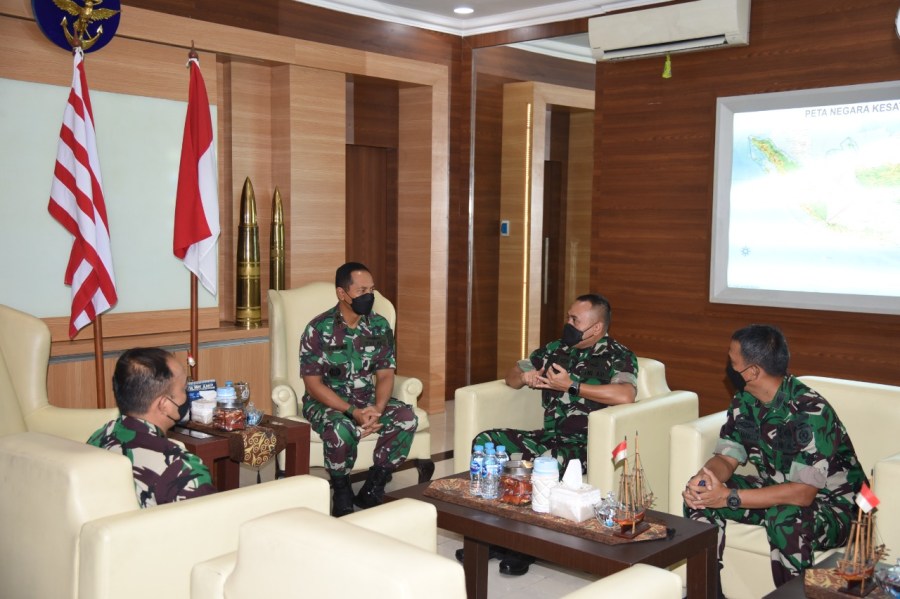 Panglima Komando Lintas Laut Militer Laksda TNI Erwin S. Aldedharma menerima kunjungan Asisten Operasi Kaskostrad Brigjen TNI Primadi Saiful Sulun di Mako Kolinlamil, Tanjung Priok – Jakarta Utara, Senin (9/5/2022).