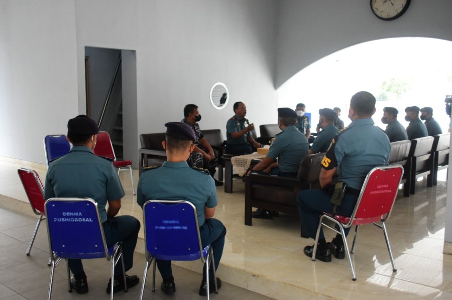 Komandan Pusat Hidro-Oseanografi TNI Angkatan Laut (Danpushidrosal) Laksamana Madya TNI Nurhidayat memberikan pembekalan kepada para calon siswa (Casis) Sekolah Tinggi Teknologi Angkatan Laut (STTAL) program Studi Hidro-Oseanografi bertempat teras lobby Pushidrosal, Jalan Pantai Kuta V/I, Ancol Timur, Jakarta Utara, Kamis (12/5/2022).