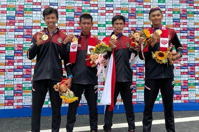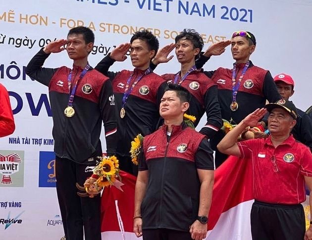 Salah satu prajurit Komando Lintas Laut Militer yang tergabung dalam Pelatnas Tim Dayung Indonesia, Sertu TTG Mahendra Yanto berhasil mengharumkan nama Bangsa Indonesia sekaligus mengibarkan bendera Merah Putih di perhelatan olah raga internasional setelah berhasil mendulang medali emas di kejuaraan dayung ajang Sea Games ke-31 di Nguyen Hai Phong Aquatics Center, Vietnam, Jumat (13/5/2022). Medali emas tersebut dari kategori nomor tanding rowing pendayung 4 orang dengan jarak 2000 meter.