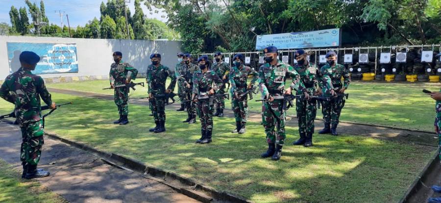 Prajurit Satuan Lintas Laut Militer 3 melaksanakan praktek lapangan Latihan Pangkalan P5T yang dilaksanakan di lapangan tembak pistol Lantamal VI Makassar, Rabu (18/5/2022). Latihan ini diselenggarakan sesuai dengan program kerja Satlinlamil 3 Triwulan II tahun 2022 dengan instruktur Pgs Kasiopslat Kapten Laut (P) Hariffudin.