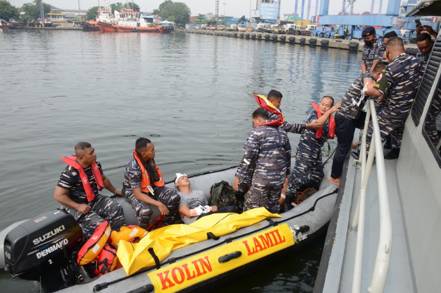 Setelah mendapatkan pembekalan teori dan drill kering, bertempat di kolam dermaga Base Plate, Mako Kolinlamil, Tanjung Priok, Jakarta Utara para prajurit Satlinlamil 1 yang mengikuti latihan SAR selanjutnya melaksanakan latihan praktek lapangan penyelamatan korban kecelakaan di laut, Kamis (19/5/2022).