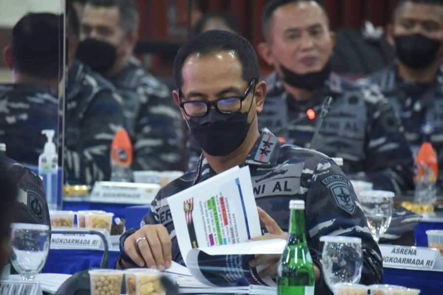 Panglima Komando Lintas Laut Militer Laksda TNI Erwin S. Aldedharma mengikuti paparan Konsep Rencana Operasi Trisila dan paparan Rencana Garis Besar Latihan Operasi Laut serta Rencana Penembakan Senjata Strategis TNI Angkatan Laut tahun 2022 yang dilaksanakan di Lounge Macan Kumbang, Mako Koarmada I, Jakarta Pusat, Kamis (2/6/2022).