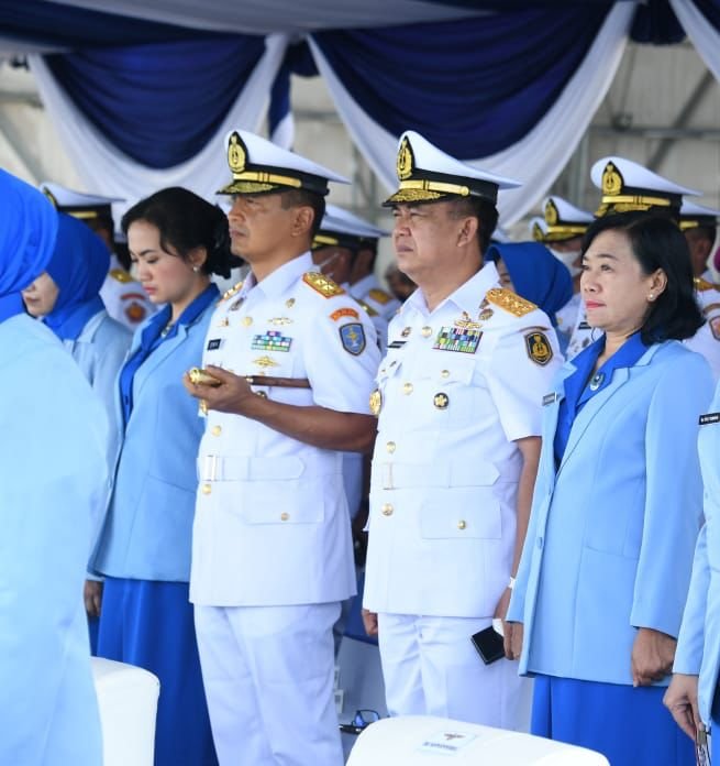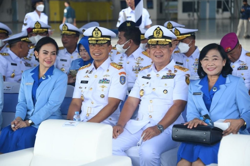 Panglima Komando Lintas Laut Militer Laksda TNI Erwin S. Aldedharma menghadiri upacara HUT ke-66 Penerbangan TNI Angkatan Laut tahun 2022 yang dipimpin oleh Kepala Staf Angkatan Laut Laksamana TNI Yudo Margono di apron hanggar Lanudal Juanda, Surabaya, Jumat (17/6/2022).