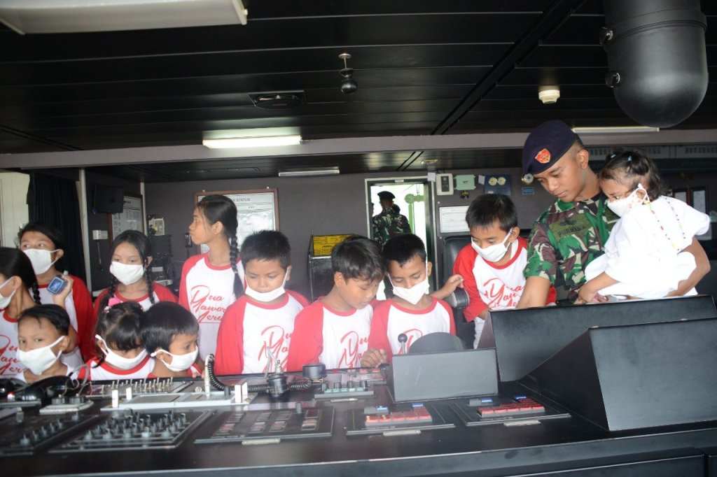Wisata edukasi “warship tour” yang dicanangkan oleh Komando Lintas Laut Militer sebagai wahana untuk publikasi alusista TNI AL menjadi daya tarik tersendiri bagi kaum pelajar untuk mengobati rasa ingin tahu dan rasa penasarannya tentang segala hal yang ada di kapal perang. Pandemi Covid-19 yang belum dinyatakan berakhir tidak menyurutkan para pelajar dari SD/SMP Sekolah Darurat Kartini Penjaringan Jakarta Utara dan Yayasan Islam as Sa’Adah Raudhatul Athfal Pondok Kopi, Duren Sawit, Jakarta Timur untuk berkunjung ke kapal perang di Kolinlamil. Dengan tetap menerapkan protokol kesehatan para pelajar dengan penuh antusias menaiki KRI Banda Aceh-593 yang saat ini sedang sandar di dermaga Mako Kolinlamil, Tanjung Priok, Jakarta Utara, Senin (20/6/2022).