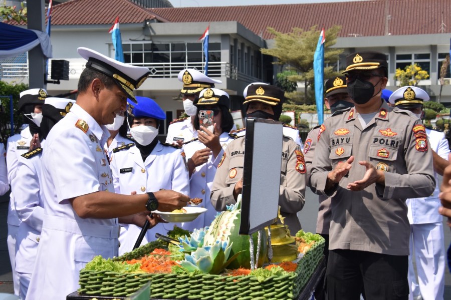 Pemotongan tumpeng oleh Panglima Kolinlamil selanjutnya diserahkan kepada Wakapolres Pelabuhan Tanjung Priok Kompol Yunita Natalia Rungkat dan Wakapusdik Polair AKBP Mas Anton Widyodigdo.