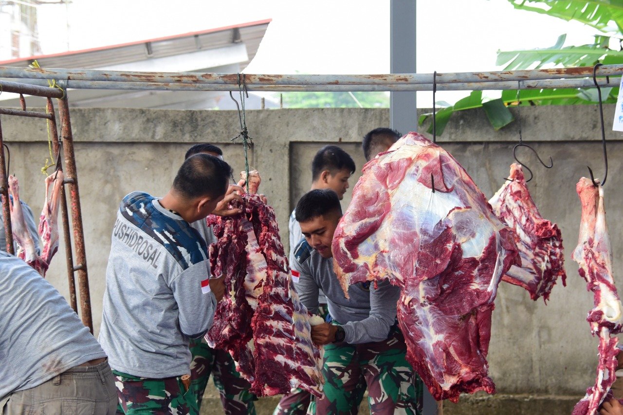 Di hari kedua lebaran Idul Adha 1443 H/2022 M, Pusat Hidro-Oseanografi TNI Angkatan Laut (Pushidrosal) masih melaksanakan kegiatan Pemotongan hewan qurban di lapangan kantor Pushidrosal Sunter Kodamar Jakarta Utara. Senin (11/7/2022).