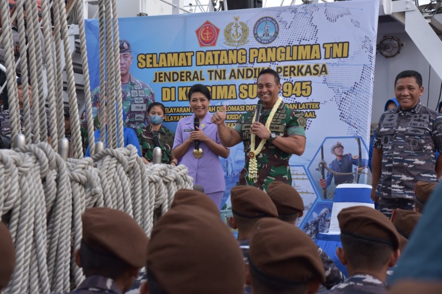 Tiba di KRI Bimasuci, Panglima TNI disambut tarian selamat datang dan brassband oleh Taruna/Taruni AAL. Acara dilanjutkan dengan paparan dari Komandan Satgas KJK tahun 2022 sekaligus Komandan KRI Bimasuci Letkol Laut (P) M.Sati Lubis.