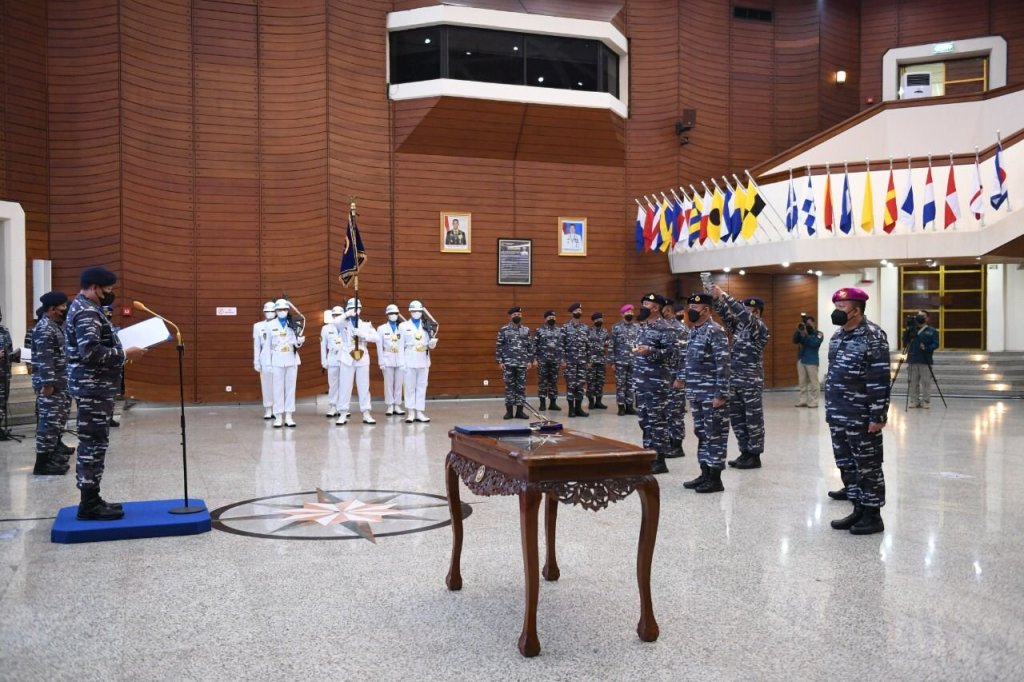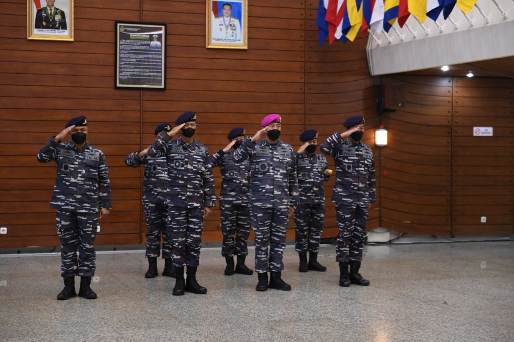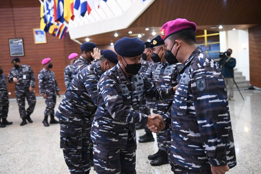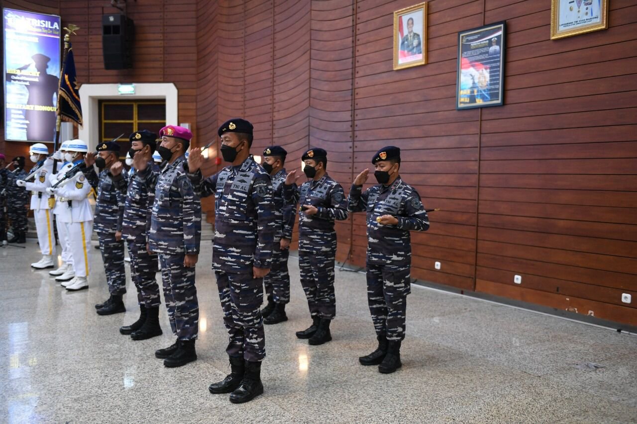 Panglima Komando Lintas Laut Militer Laksda TNI Agus Hariadi menghadiri upacara serah terima jabatan dan acara laporan korps kenaikan pangkat Perwira Tinggi TNI AL yang dipimpin oleh Kepala Staf Angkatan Laut Laksamana TNI Yudo Margono di Auditorium Denma Mabesal, Cilangkap, Jakarta Timur, Senin (1/8/2022).