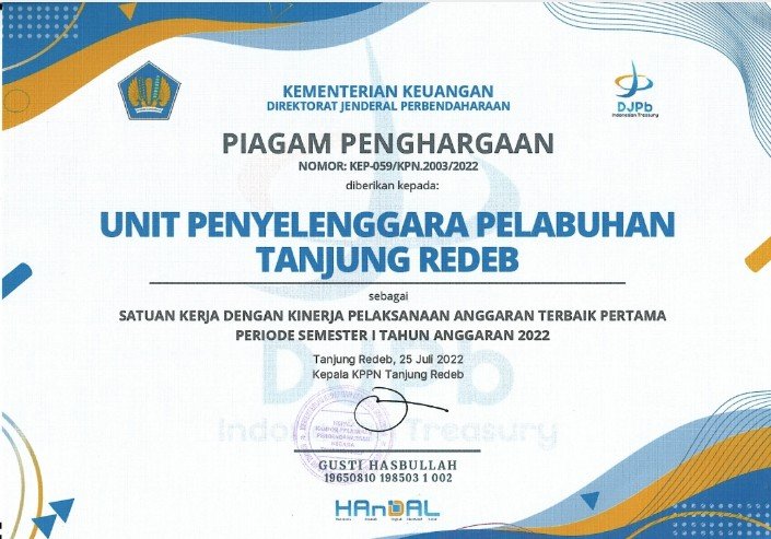 Kementerian Perhubungan Cq Direktorat Jenderal Perhubungan Laut melalui Kantor Unit Penyelenggara Pelabuhan ( KUUP) Kelas II Tanjung Redeb menerima Piagam Penghargaan dari Kantor Pelayanan Perbendaharaan Negara Tipe A2 ( KPPN) – Kementerian Keuangan Tanjung Redeb, Kabupaten Berau.