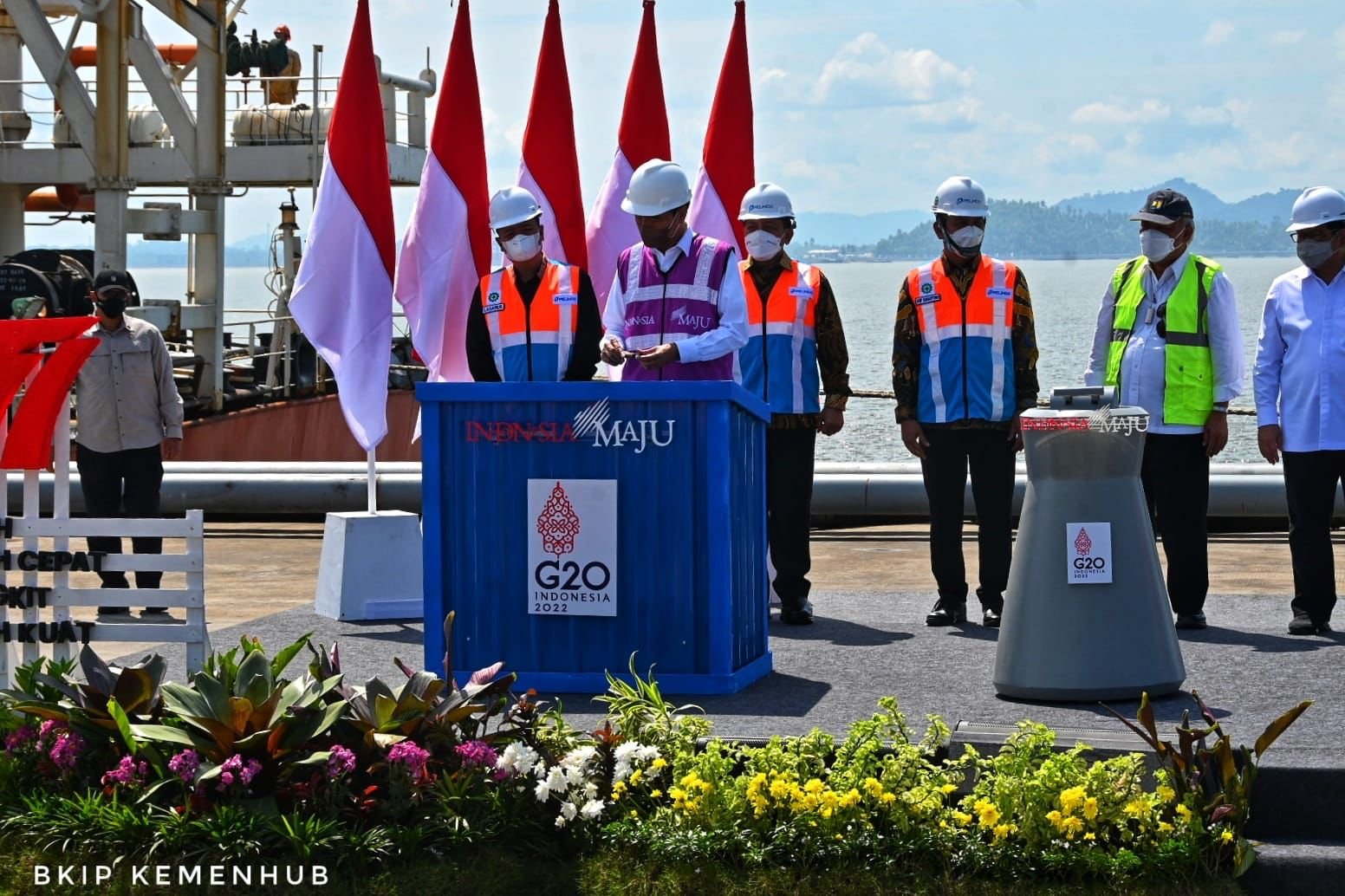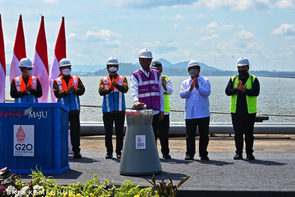 Presiden Republik Indonesia Joko Widodo didampingi oleh Menteri Perhubungan Budi Karya Sumadi, meresmikan Terminal Kijing Pelabuhan Pontianak, di Kabupaten Mempawah, Provinsi Kalimantan Barat, hari ini Selasa (9/8/2022).