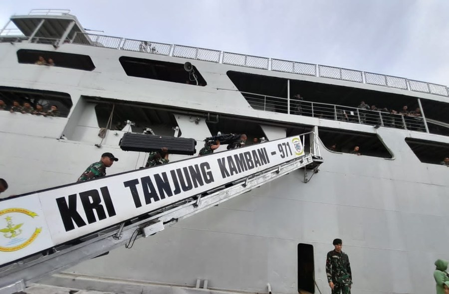 Mengemban misi operasi dukungan angkutan laut militer pergeseran pasukan dan materiil Satuan Tugas Satuan Organik Provinsi Papua tahun 2022, KRI Tanjung Kambani-971 yang saat ini sandar di Dermaga Madura Komando Armada II melaksanakan embarkasi pasukan dan materiil pasukan Batalyon Infanteri Raider 514/ Sabbada Yudha, Senin (15/8/2022).