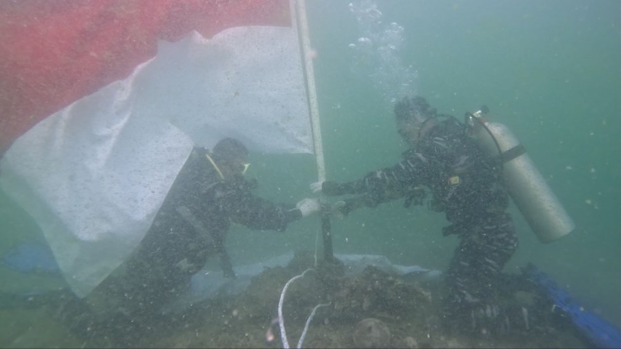 Dalam rangka memperingati Hari Kemerdekaan Republik Indonesia ke-77, Pusat Hidro-Oseanografi TNI AL (Pushidrosal) mengibarkan Bendera Merah Putih di dasar laut perairan Pulau Damar, Kepulauan Seribu, Rabu (17/8/2022).