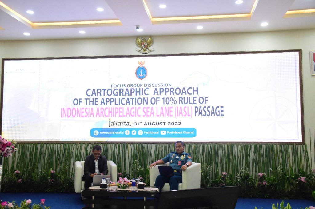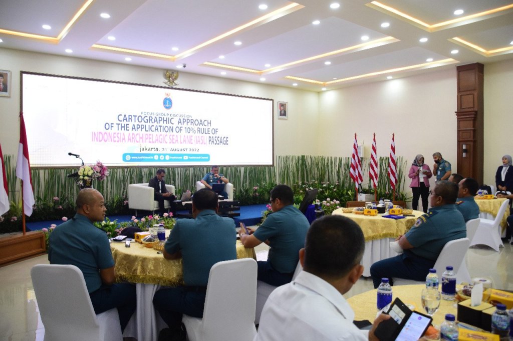 Pusat Hidro-oseanografi TNI Angkatan Laut (Pushidrosal) menyelenggarakan Focus Group Discussion (FGD) tentang Pendekatan Kartografi Penerapan Sepuluh Persen Rule Of Indonesian Archipelagic Sea Lane (IASL) di Mako Pushidrosal, Ancol Timur, Jakarta Utara, Rabu (31/8/2022)