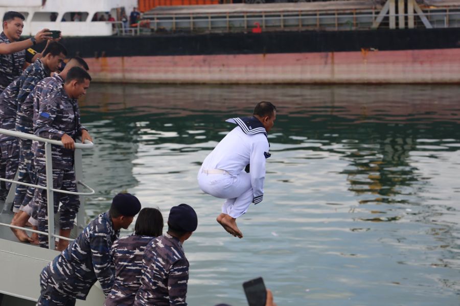 Bagi prajurit Bintara dan Tamtama dilaksanakan tradisi khas TNI-AL yaitu Voor den Boeg di geladak haluan KRI Banda Aceh-593, karena 3 prajurit berpangkat Kelasi Kepala naik menjadi Kopral Dua. Selanjutnya seluruh prajurit KRI Banda Aceh-593 memberi ucapan selamat kepada prajurit yang telah naik pangkat dan dilaksanakan tradisi lompat kelaut dari atas kapal.