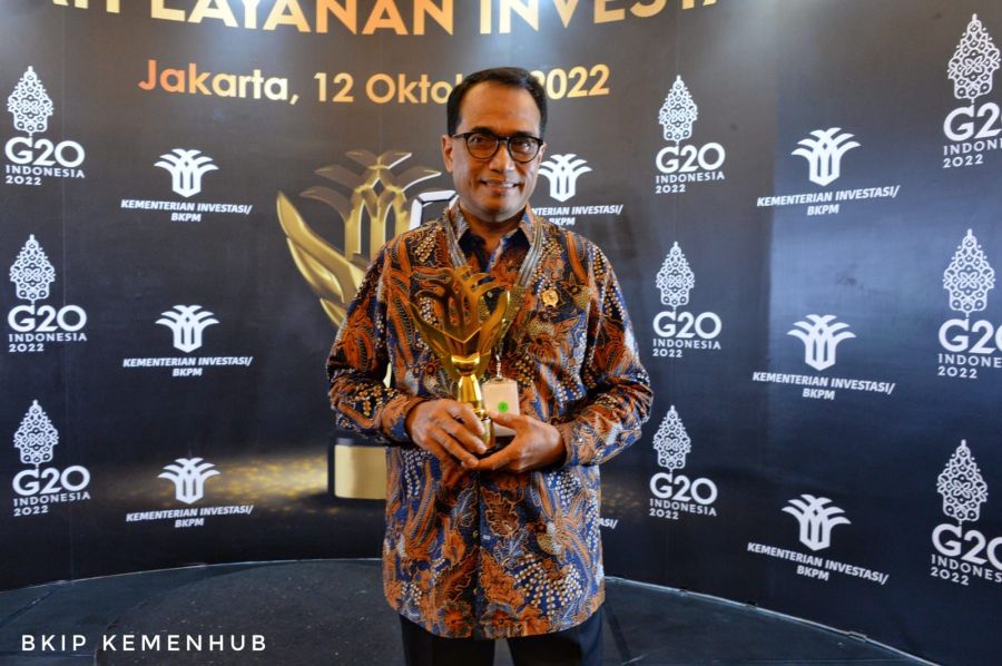 Menteri Perhubungan Budi Karya Sumadi menerima penghargaan tersebut, yang disaksikan langsung oleh Wakil Presiden RI Ma’ruf Amin dan Menteri Investasi/Kepala BKPM Bahlil Lahadalia, di Jakarta, Rabu (12/10/2022).