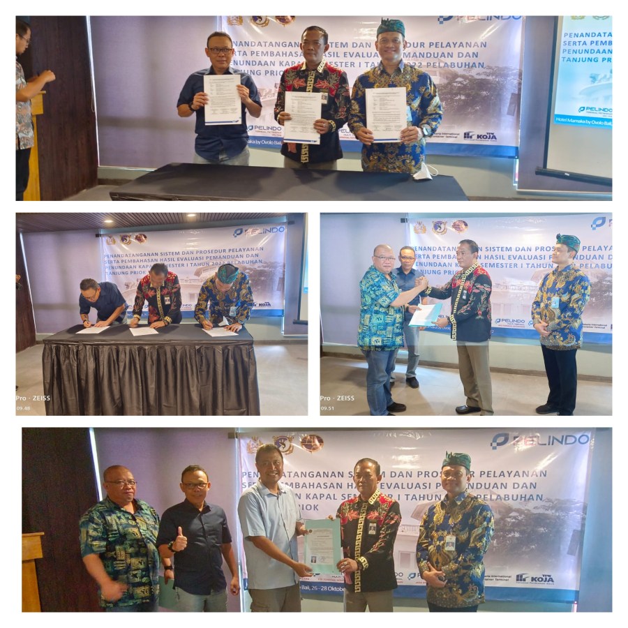 Kementerian Perhubungan Cq Direktorat Jenderal Perhubungan Laut melalui Kantor Kesyahbandaran Utama (KSU) Pelabuhan Tanjung Priok, Kantor Otoritas Pelabuhan Utama Pelabuhan Tanjung Priok menyelenggarakan kegiatan penandatanganan sistem prosedur pelayanan dan pembahasan hasil evaluasi Pemanduan dan Kapal Semester I Tahun 2022 Pelabuhan Tanjung Priok dengan Pelindo Regional 2 Tanjung Priok, bertempat di Hotel Mamaka, Bali, Kamis (27/10/2022).