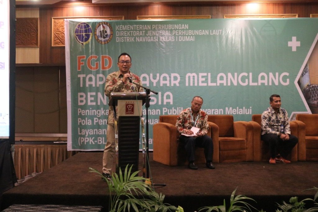 Kepala Kantor Distrik Navigasi Kelas I Dumai Capt Heru Susanto mengatakan kegiatan Forum Group Disscusion diselenggarakan dalam rangka peningkatan pelayanan publik pelayaran melalui Pola Pengelolaan Keuangan Badan Layanan Umum (PPK_BLU) di Kantor Distrik Navigasi Kelas I Dumai.