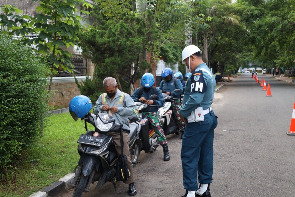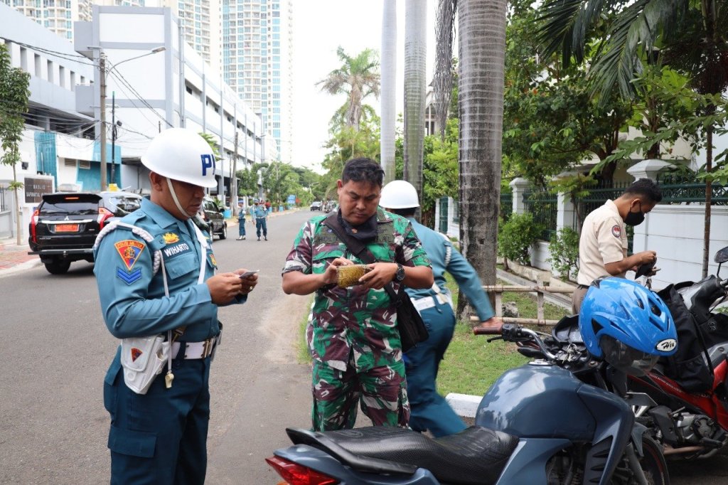 TNI AL Satuan Provos Pusat Hidro-Oseanografi TNI Angkatan Laut (Pushidrosal) menggelar operasi Penegakan Ketertiban Disiplin bertempat di Jalan raya Pintu Masuk Mako Pushidrosal, Jl. Pantai Kuta V/I. Senin (21/11/2022).