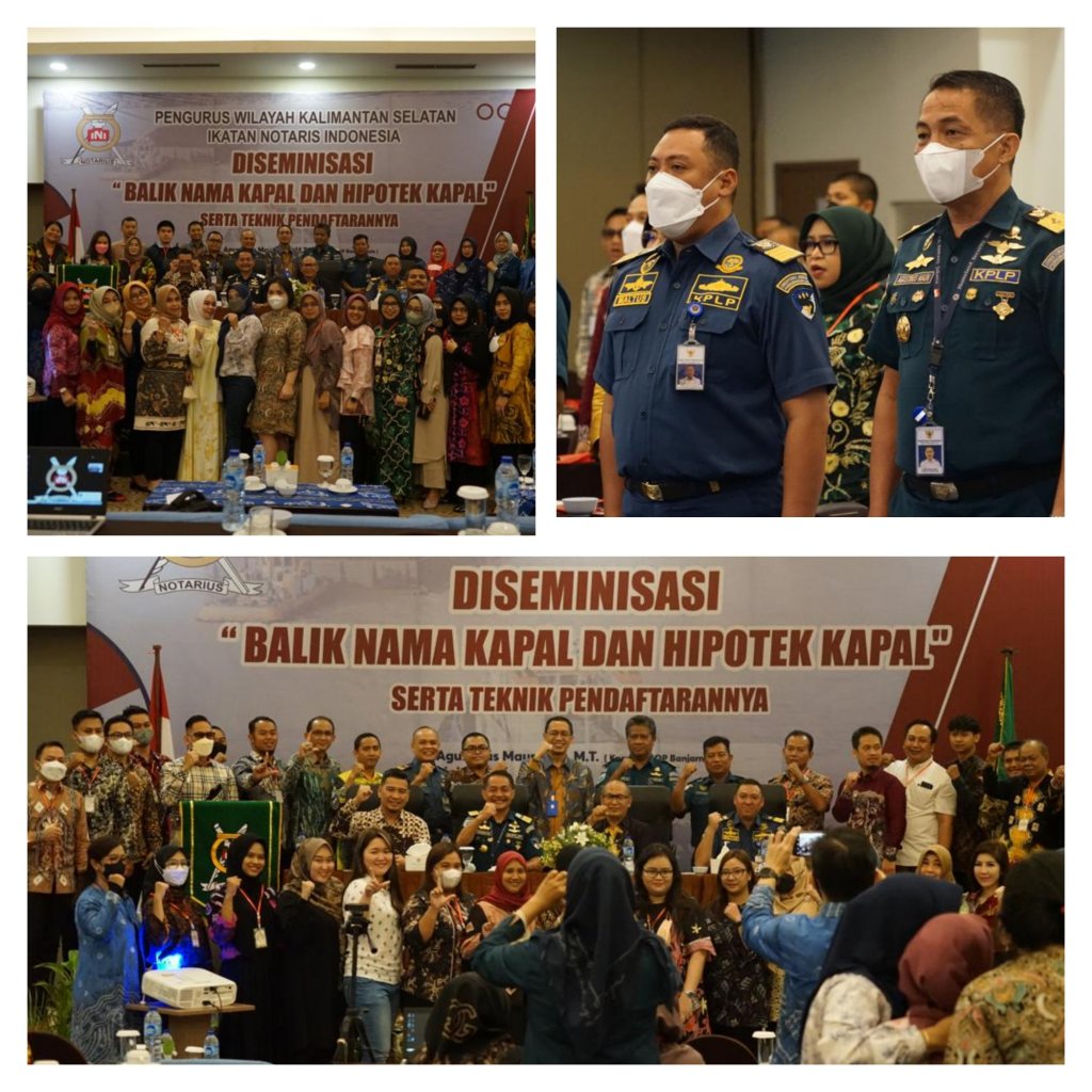 Kegiatan Diseminasi Balik Nama dan Hipotek Kapal serta Teknik Pendaftarannya menghadirkan Keynote Speaker Agustinus Maun, S.T., M.T. Kepala Kantor KSOP Kelas I Banjarmasin, Narasumber pemateri pertama Dr. Anriz Halim, S.H., M.H., M.KN. Notaris PPAT Jakarta Barat Dewan Pakar PP INI dan pemateri kedua Capt. Maltus Jackline Kapistrano, S.SiT., M.Si. Kabid Status Hukum dan Sertifikasi Kapal dan Pipit Jafari, S.H. Petugas Pendaftaran dan Balik Nama Kapal.