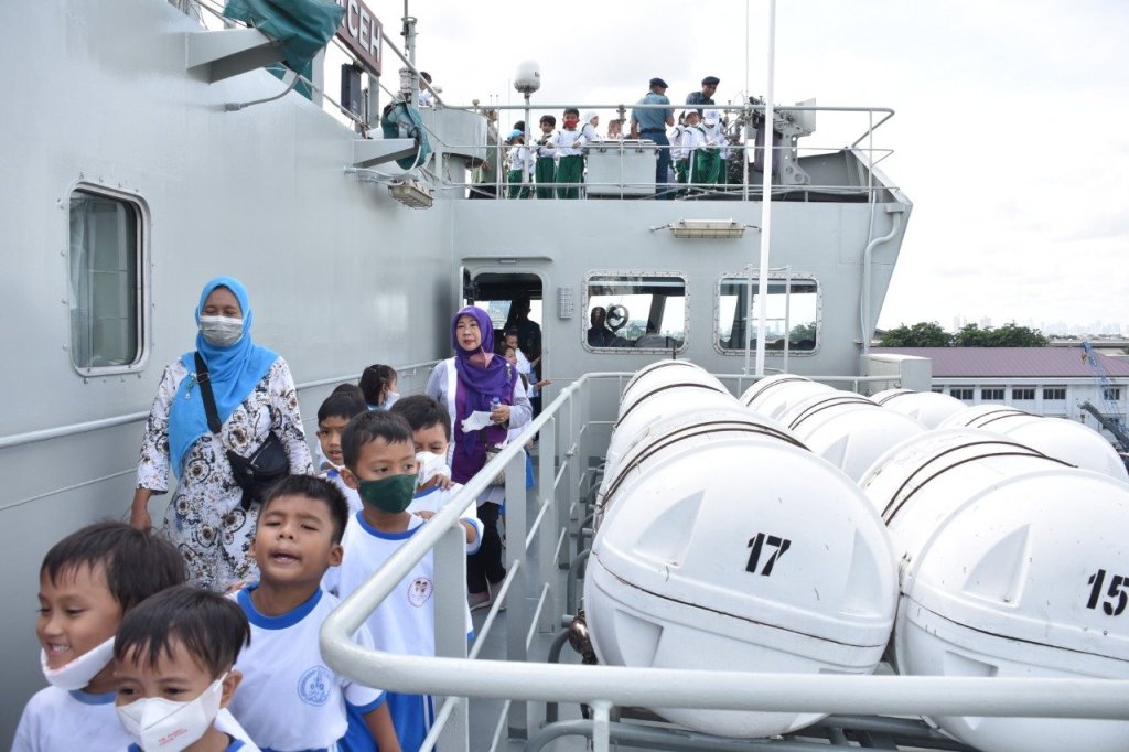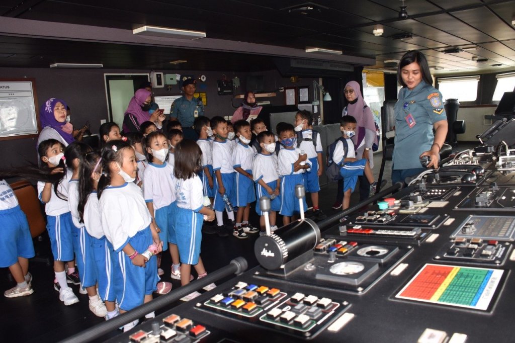 Cuaca cerah di pagi hari membuat siswa TK Melinia, TK Al Hikmah dan TK Dahlia semakin antusias mengikuti kegiatan wisata edukasi di KRI Banda Aceh-593 yang saat itu sandar di Dermaga Mako Kolinlamil. Didampingi pemandu dari prajurit KRI BAC-593, para siswa dan guru pendamping berkeliling KRI melihat-lihat fasilitas yang ada di KRI serta mendapatkan penjelasan tentang fungsi peralatan yang ada.