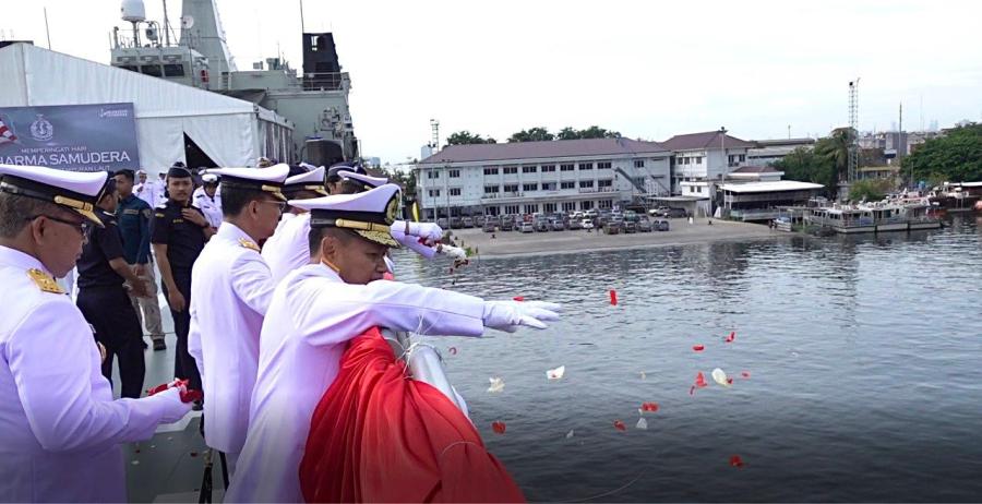 Peringatan Hari Dharma Samudera tahun ini mengangkat tema “Kobarkan Semangat Perjuangan Samudera untuk Kejayaan Indonesia”. Puncak upacara peringatan Hari Dharma Samudera ditandai dengan upacara tabur bunga dari atas geladak Heli KRI Banda Aceh-593 yang saat ini tengah sandar di dermaga Mako Kolinlamil, Tanjung Priok, Jakarta Utara dan dipimpin langsung oleh Kepala Staf Angkatan Laut Laksamana TNI Muhammad Ali, Senin (16/1/2023). Tampak hadir dalam upacara tersebut sejumlah pejabat utama Mabesal dan Pemimpin Kotama TNI AL yang berada di Jakarta.
