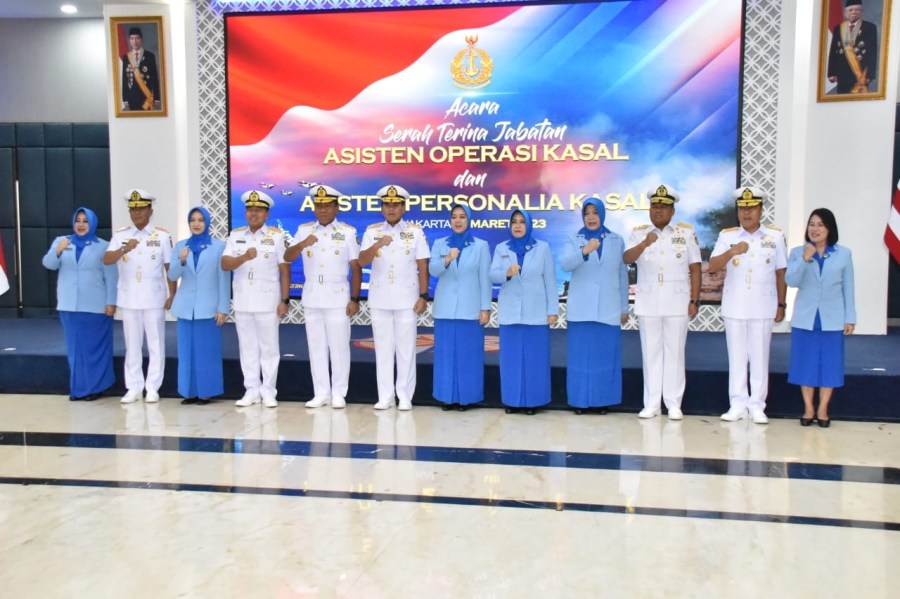 Panglima Komando Lintas Laut Militer Laksda TNI Yayan Sofiyan didampingi Ketua Gabungan Jalasenastri Kolinlamil Ny. Peni Yayan Sofiyan menghadiri upacara serah terima Jabatan Asisten Operasi dan Asisten Personel Kasal yang dipimpin oleh Kepala Staf Angkatan Laut Laksamana TNI Muhammad Ali di Wisma Elang Laut, Menteng, Jakarta Pusat, Senin (6/3/2023).