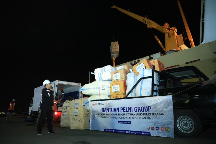 PT Pelayaran Nasional Indonesia atau PT PELNI (Persero) mengirimkan barang bantuan bagi korban bencana banjir dan tanah longsor di Kecamatan Serasan, Kabupaten Natuna, Kepulauan Riau. Barang bantuan dikirim dengan menggunakan KM Bukit Raya saat sandar di Pelabuhan Tanjung Perak, Surabaya, Kamis (9/3/2023).